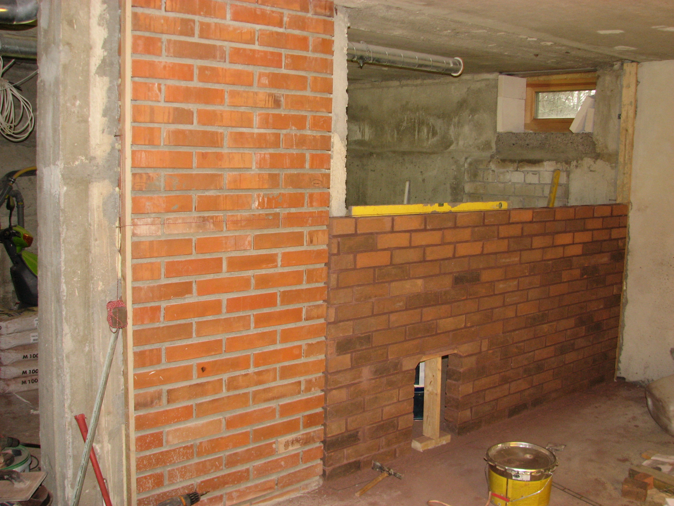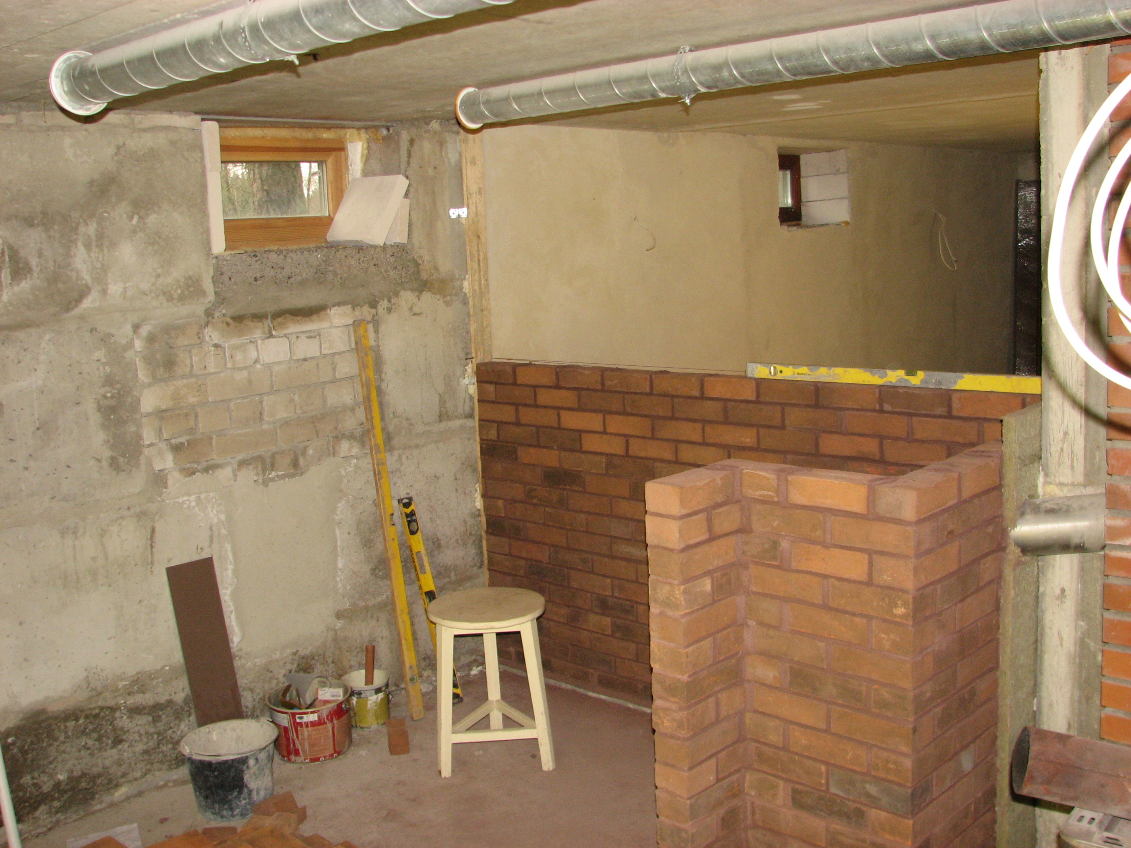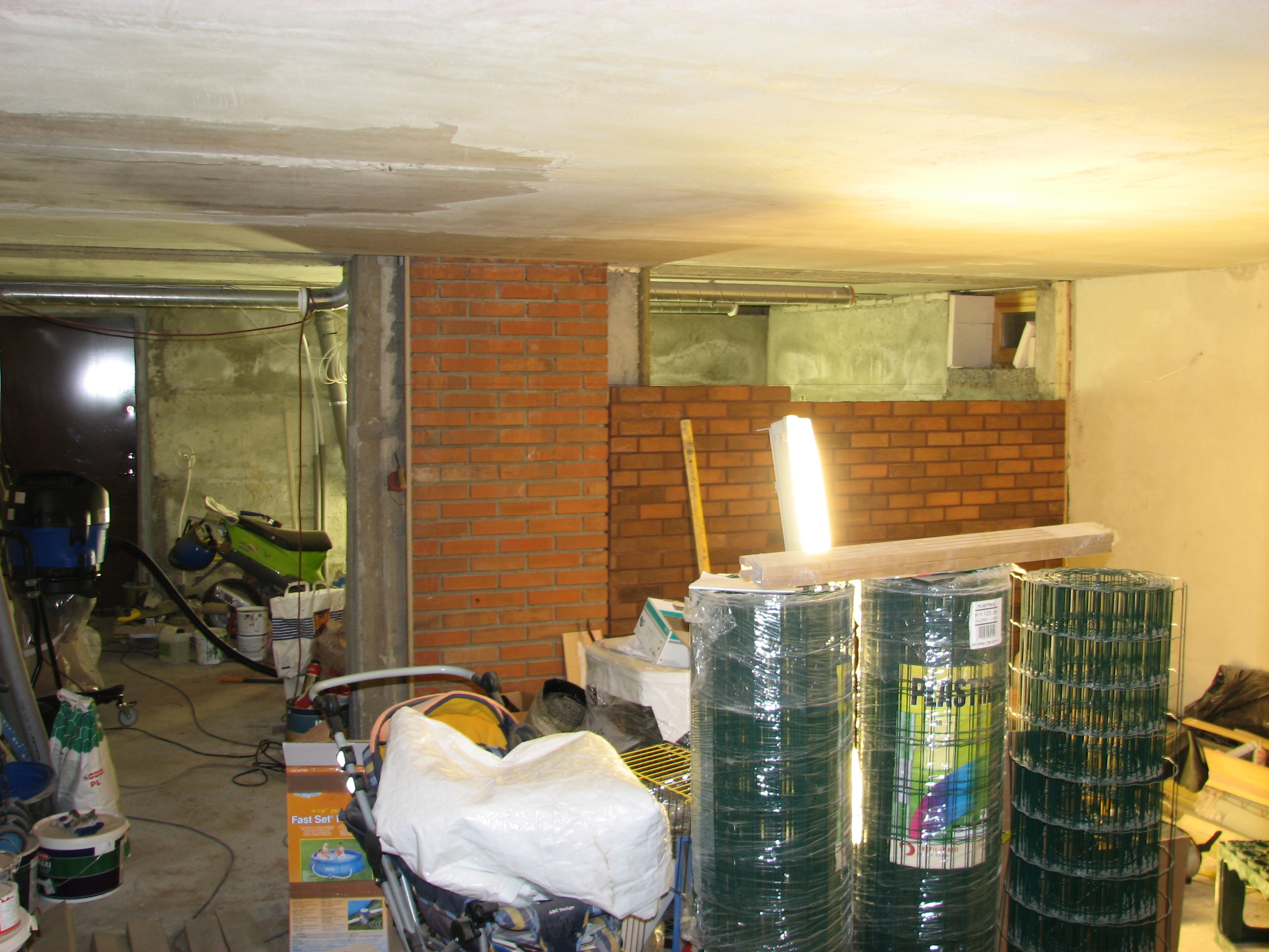 Teha vaja: Lõpuni laduda leiliruumi ja kaminaruumi vaheline tellissein 8 rida. Jämepahteldada leili ja pesuruumi seinad, laed ja vedela hüdroga üle. Leiliruumi tulevad tegema teised mehed. Kaminaruumi seinad pahteldada siledaks ja laed strukuurpahtedada e. risti-rästi „lohaka“ pahteldusega. Momendil on nad krohvitud 90% siledaks. Kaminaruumi akna ja uste paled viimistleda. Ehitada välja pesuruumi seinad ja laed. Tegemist saab olema põhiruumist õhuvahega eraldatud saunaga (vaata joonist). Tasandada leili ja pesuruumi põrandad, teha kallakud, hüdro, plaatida. Pesuruumi hüdro, pildil vasakpoolse osa seinad plaatida. Ehitada kaminaruumi ühes seinas olevad venttorud ja kaablid kinni niiskuskindla vineeri või kipsiga koos paari hooldusluugiga ~200x300x8m pikkust. Tasandada kaminaruumi põrand ideaalselt siledaks. Värvida niiskuskindalte värvidega pesuruumi ülejäänud sein ja kaminaruum üleni. Kaminaruumi põrand värvida epoksüüdvärviga milles on libisemisvastast puru.