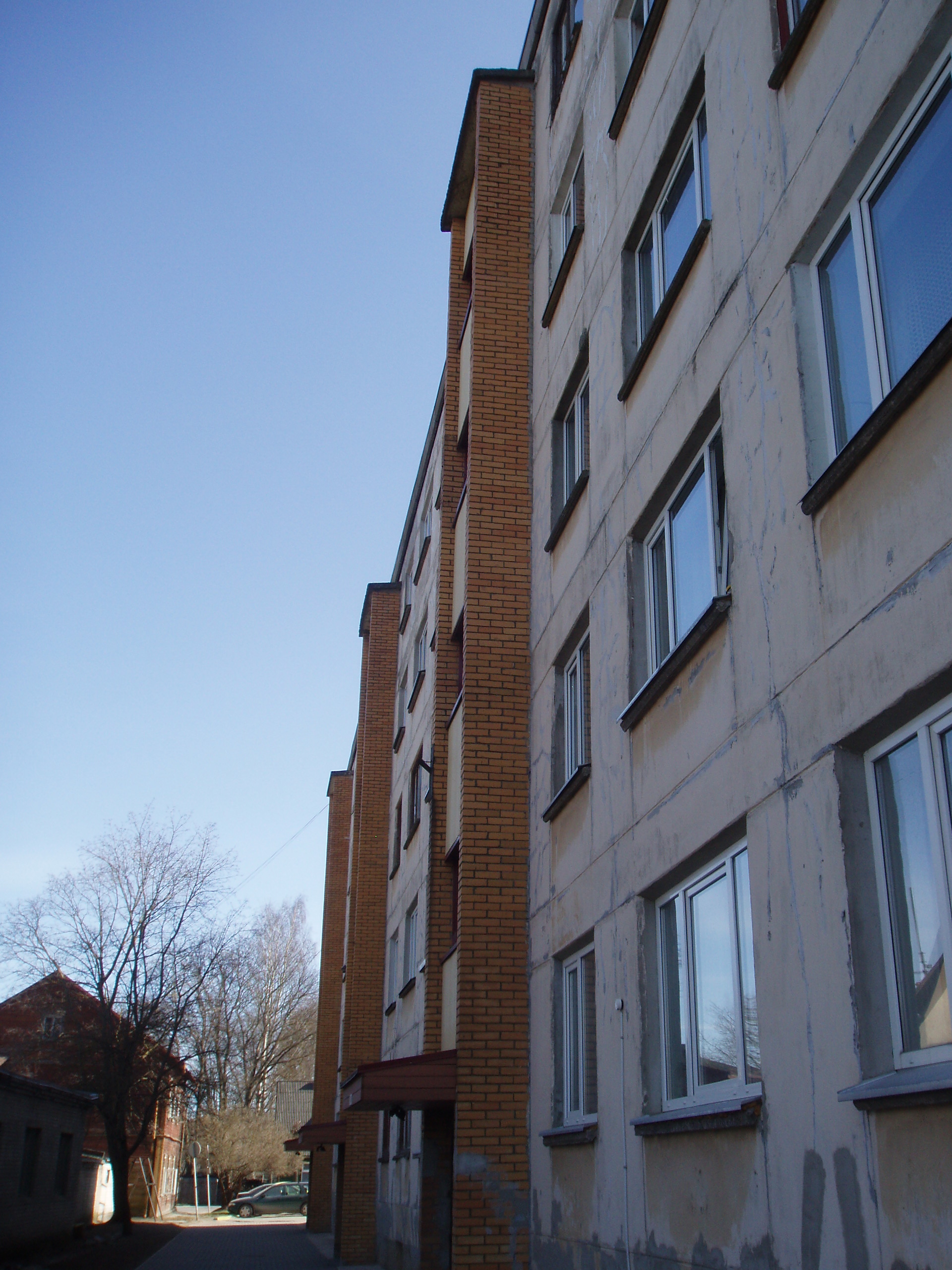 Viiekordne ja viie trepikojaga kortermaja (1968), kõrgus 15m, laius 11m, lamekatus. 1. Parandada üks maja tellistest otsasein. 2. Katta viis ülemist betoonist varikatust plekiga. 3. Katta välisfassaadil paiknevad ventilatsiooniavad restidega.
