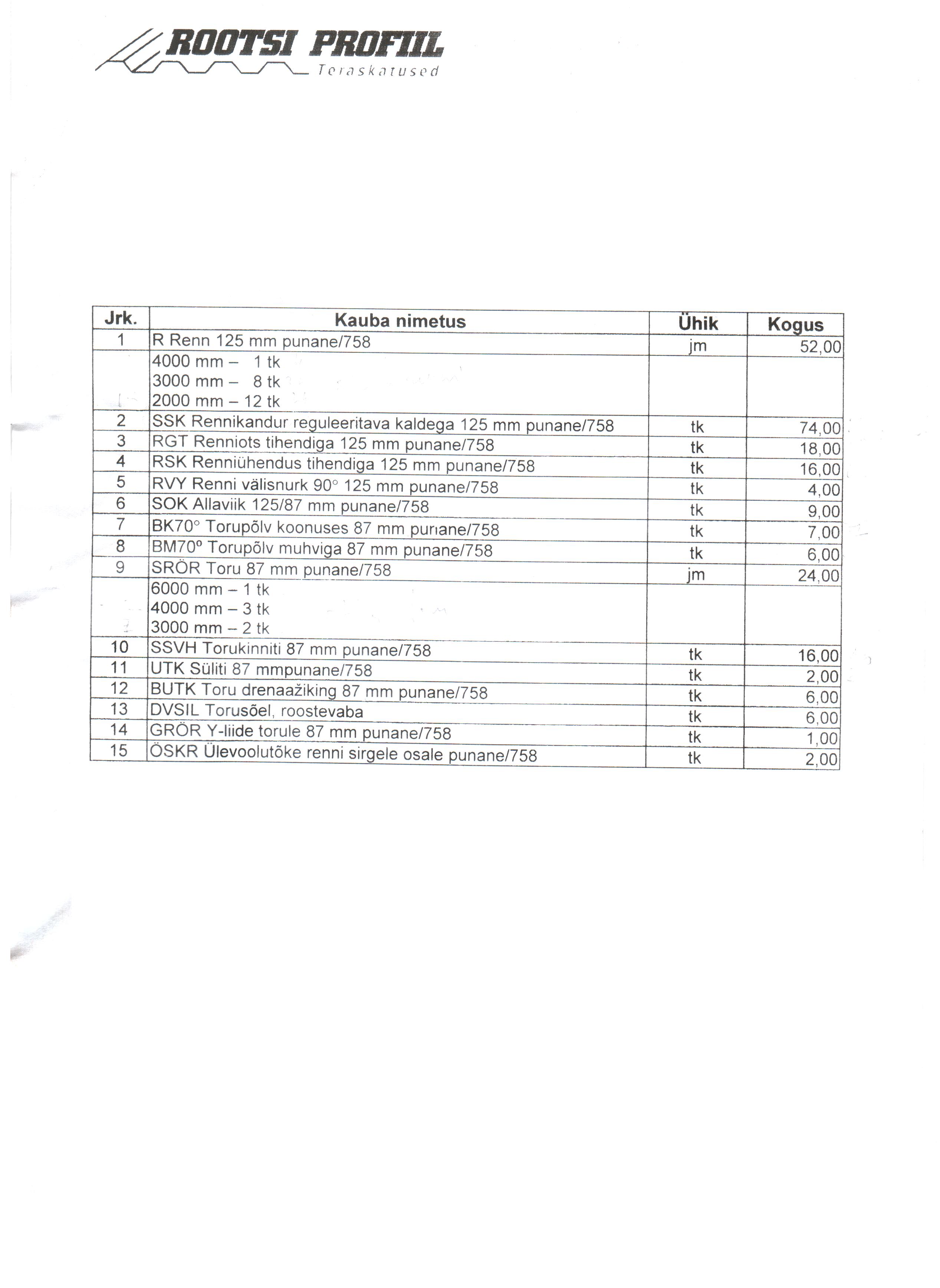 Vihmavee süsteemi (tootja Rootsi Profiil) paigaldus Tartumaa, Luunja vallas, 12km linna piirist, uus eramu, räästakastid valmis, 52 jm renni, 24 m toru, 6 allajooksu. joonised ja muu info lisatud failides. Kõik materjalid ja vajadusel tõstuk tellija poolt, pakkuda vaid tööraha kogu töödele kogumaksumuses käibemaksuta. Osaleda võiks vaid isikud, kellel on varasem kogemus, kuna hanke võitjaga sõlmin kokkuleppe pärast ühe tema varasema kliendiga suhtlemist. Hanke võitja saab töö, kui vastab kirjeldatud tingimustele. Tasumine lepingu alusel 100% vahetult pärast tööde valmimist.