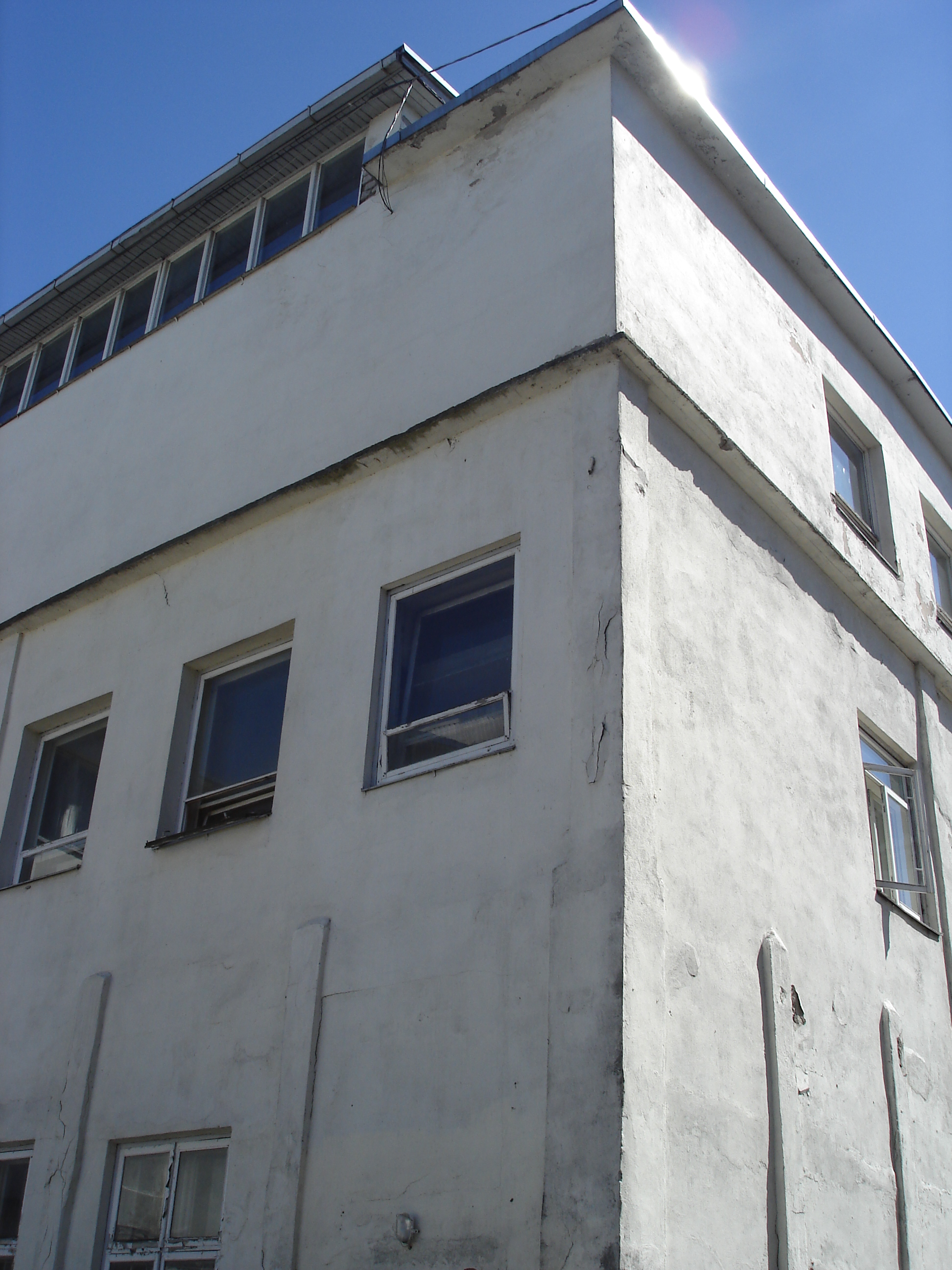 3kordne maja, kõrgus ca 11m, ehitatud 70ndatel (betoon, tellis ja tepp-plaat üle krohvitud).