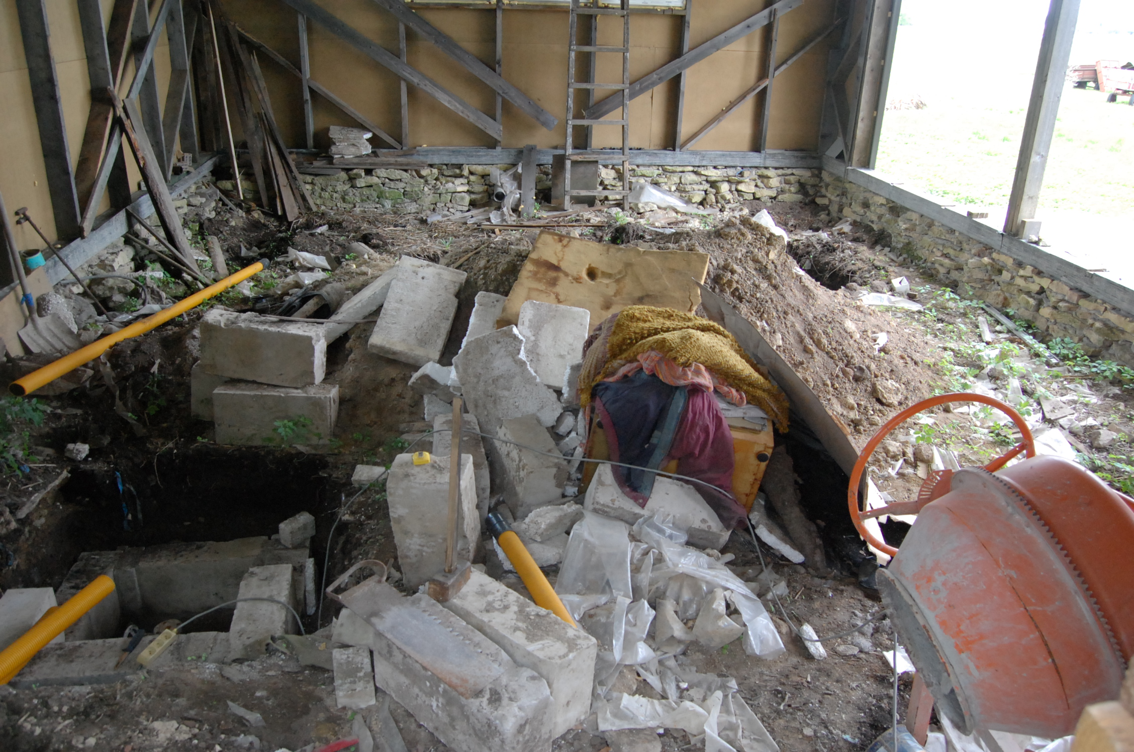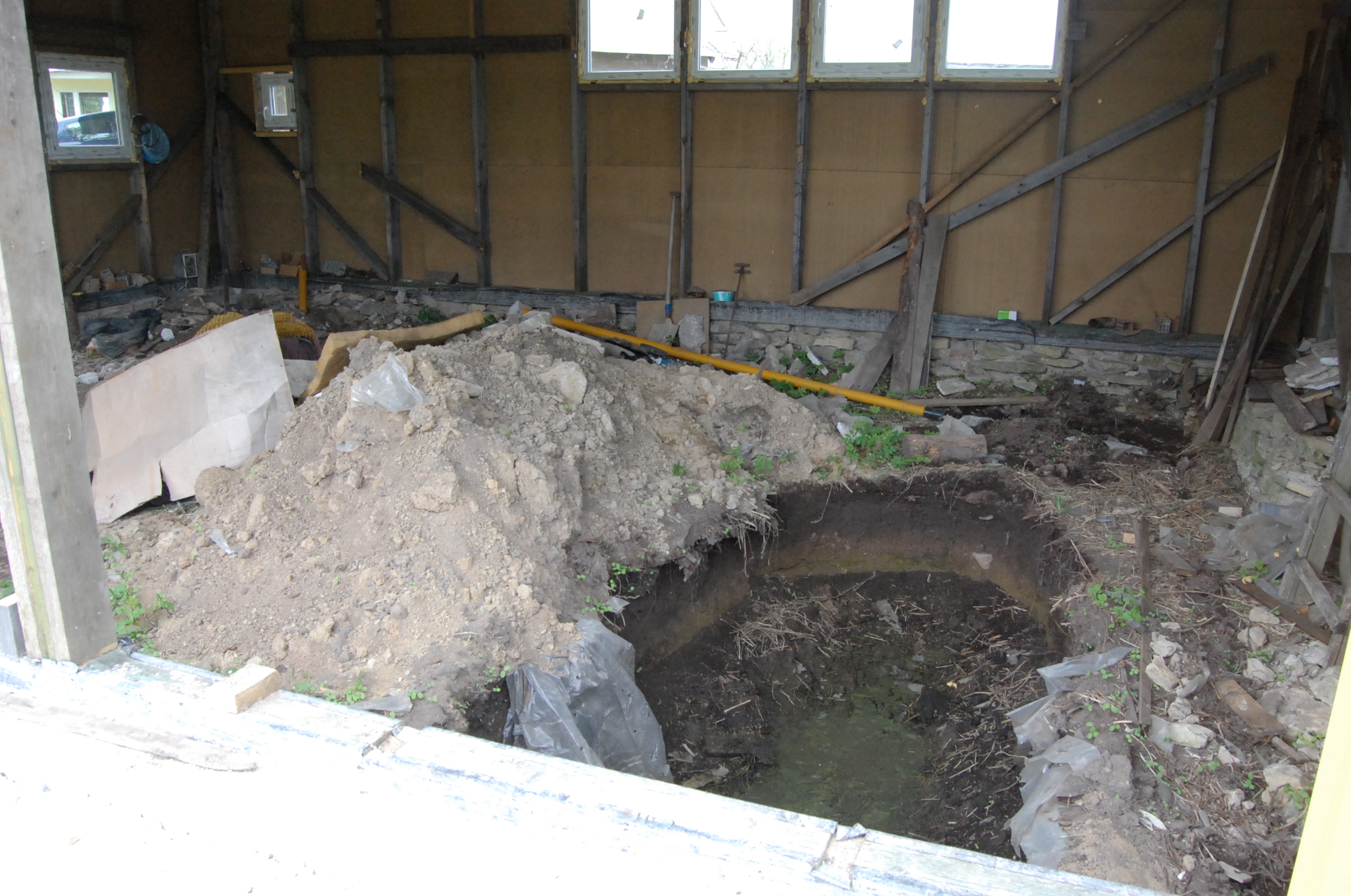 Garaazi sisemus on tühi auk, millesse on kaevatud kanali jaoks veel omakorda auk. Vaja teha sellest august kanal ja siis kogu põrand. Vee äravoolu jaoks on olemas vundamendist läbi toru. Põrandal võiks olla ka vastav kalle. Kogu pind 70 ruutu. Põrandas on veel puurkaev, selle augu lõpetan ise.