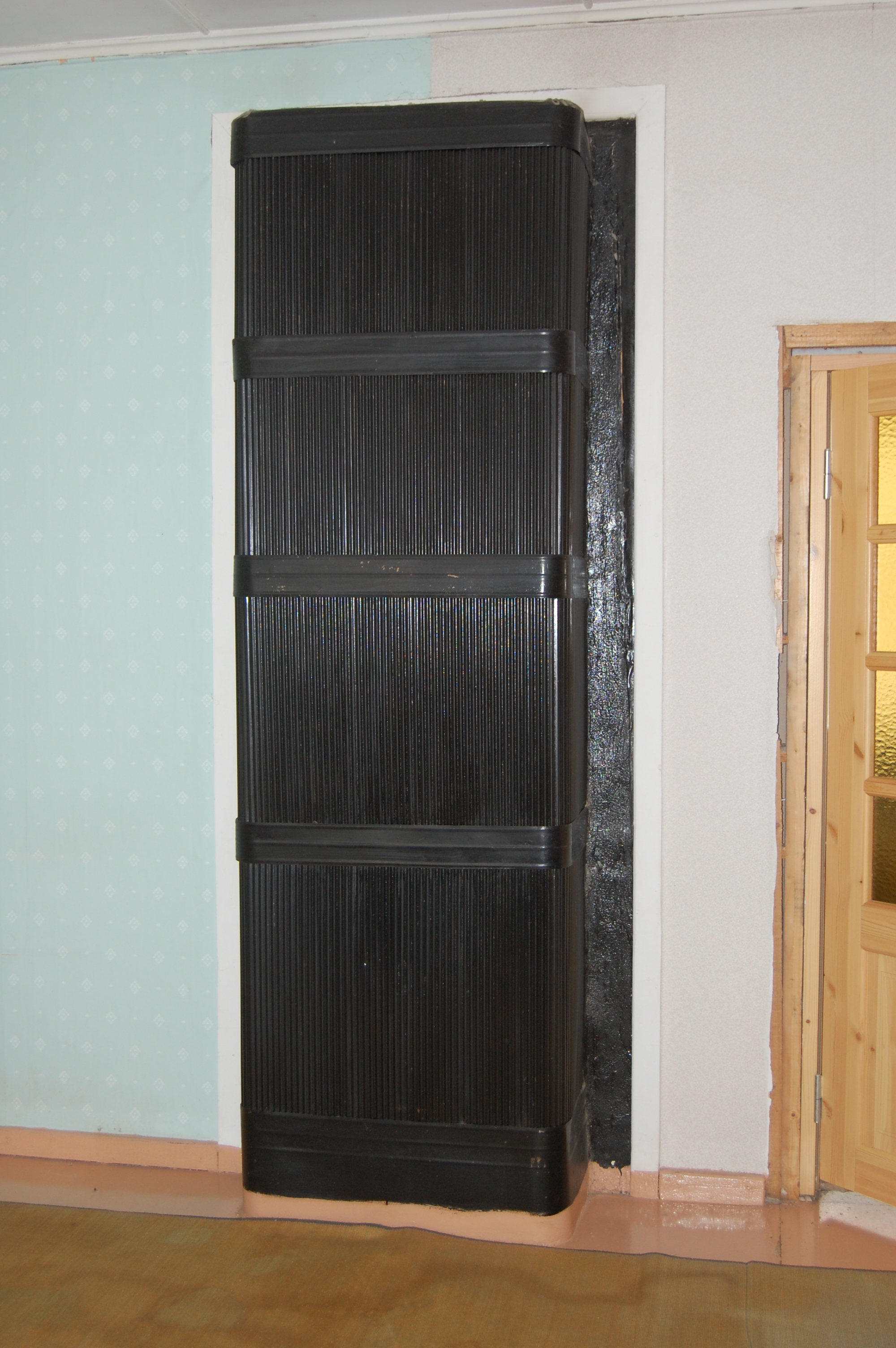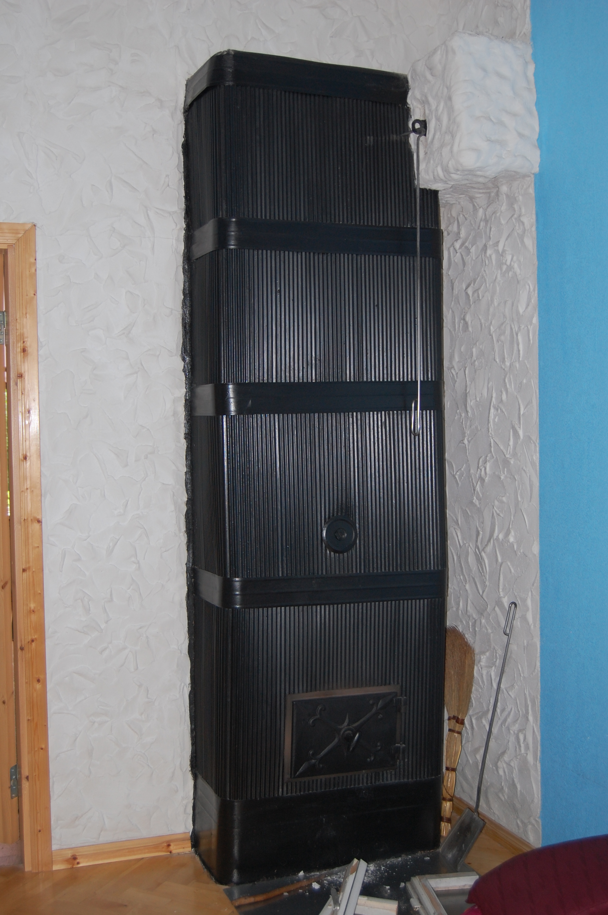 Punasest tellisest kaminahi. Nurgad kumerad, keskel astmega ja kitsama klaasuksega. Ahju kõrgus tuleb 2,55m , laius 0,8m ja pikkus 0,8m .