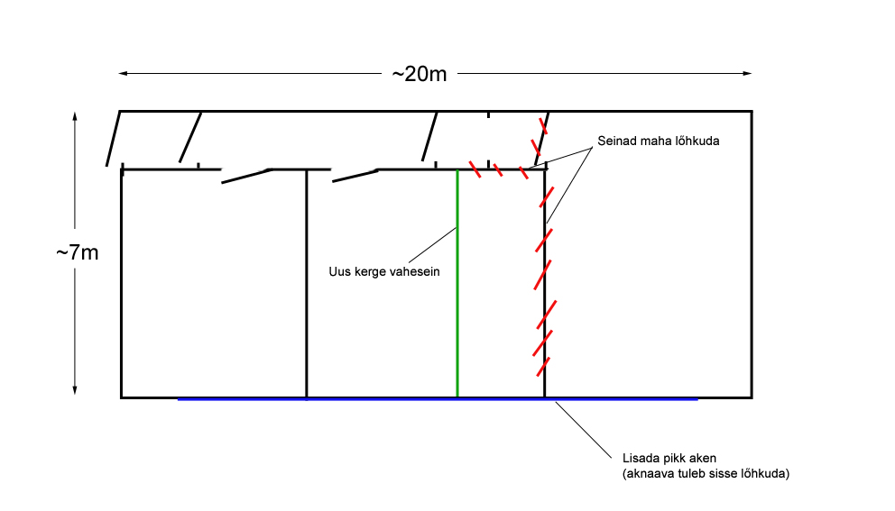 Vanade bürooruumide ümberehitus ja remont. Seinade lõhkumine/akna avade tegemine ja akende install. Kütte lisamine ruumidesse, elektri juhtmete paigaldus, isolatsioon, siseviimistlus. Kogu pinda on umbes 75m2.
