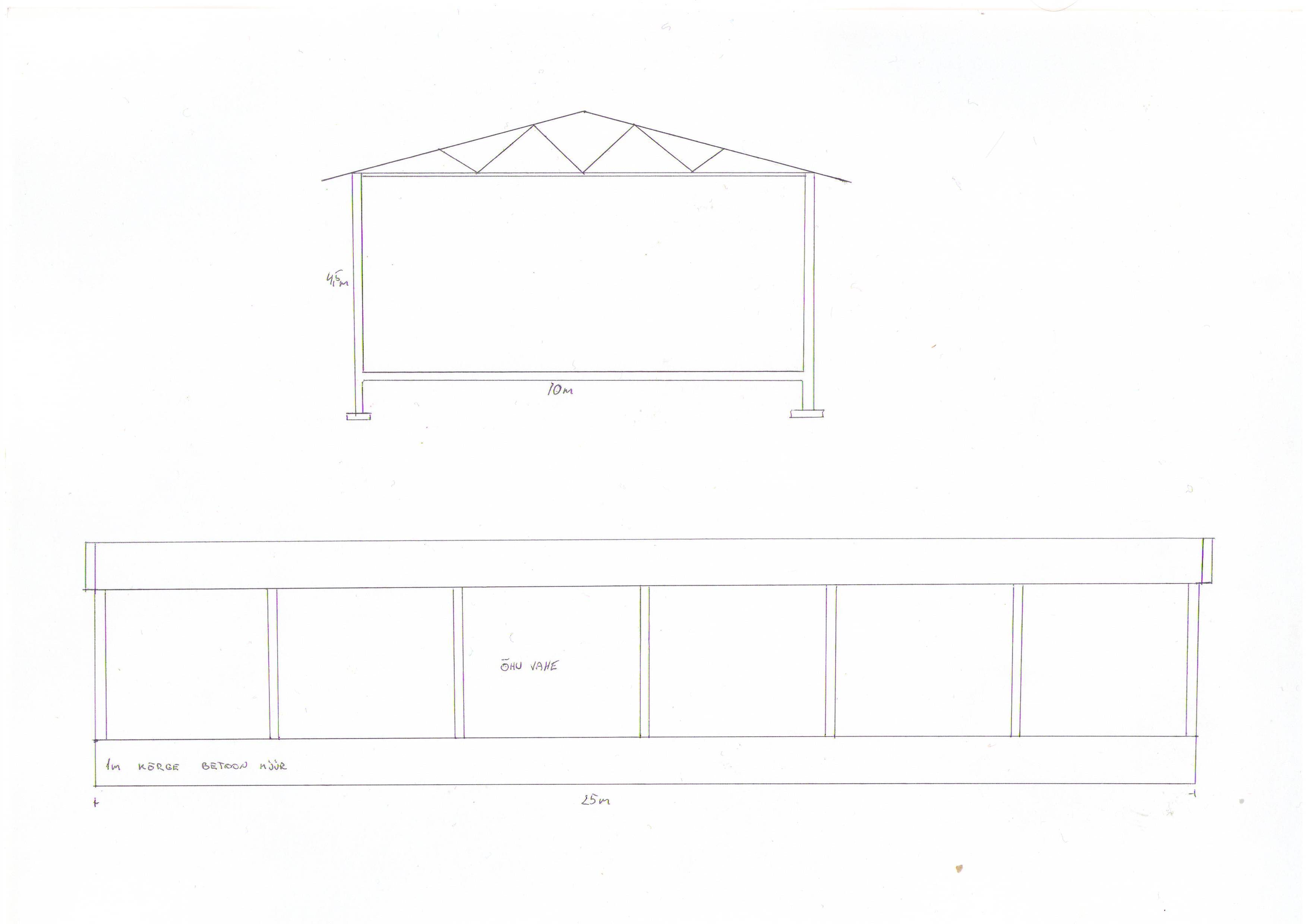 Hoone suurus 10x25meetrit. Betoneeritud põrand. Hoone pikemad seinad betoneeritud 1 meetri kõrguseni. Katuse kõrgus 4,5 meetrit.