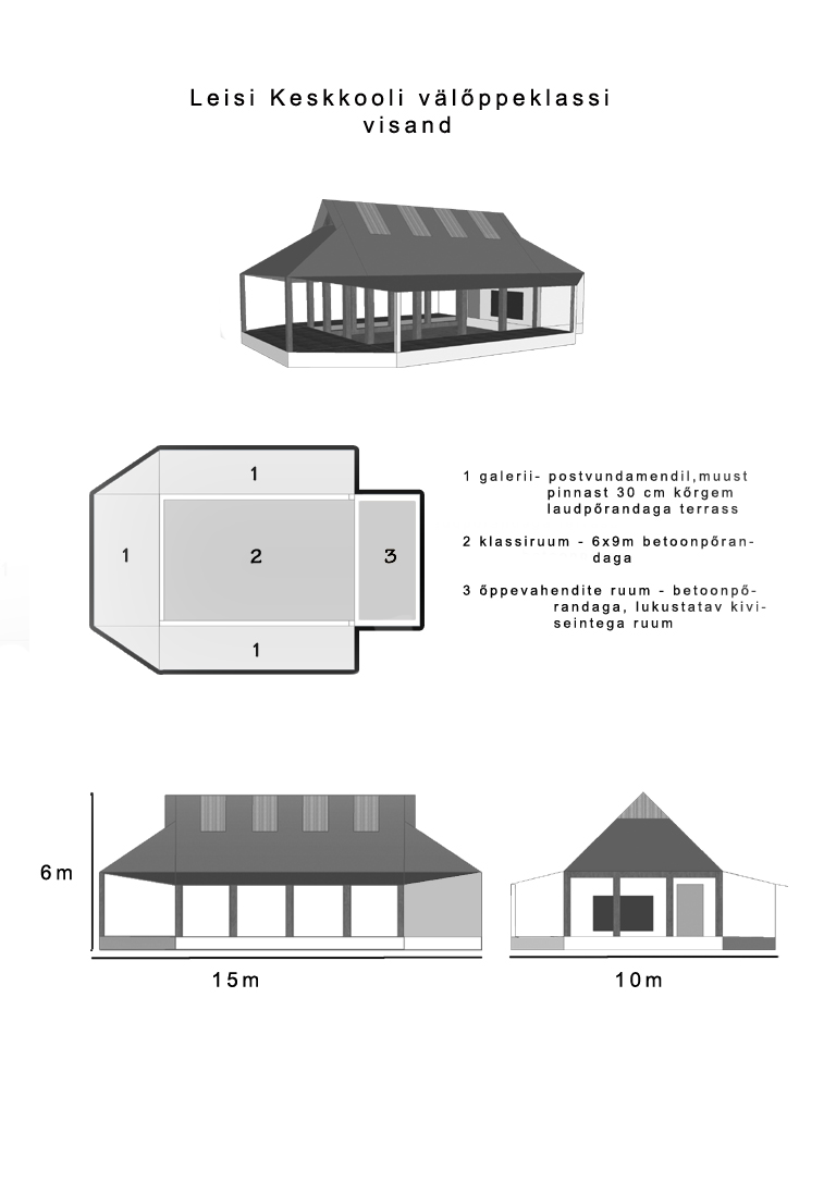 kooosneb avatud külgedega katusealusest 9x6m, mida ümbritseb terrass ja kindlate seintega lukustatava uksega õppevahendite ruumist (+wc) 3x6m betoon- või kivipõrand. vajalik vesi elekter. (koolimaja u 60m eemal)