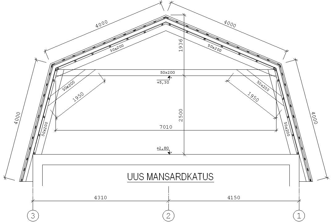 Vaja teostada vana viilkatuse demontaaz (ca.170m2) ning ehitusprügi äravedu ja uue mansardkatuse ehitus (ca.220m2). Katuse konstruktsioon jääb samaks mis vanal katusel. Katuse pikkus 13,5m, teised parameetrid ning talade sammud vt. joonis. Võimalusel teha pakkumine eraldi nii vana katuse demontaazile kui ka uue katuse ehitamisele.