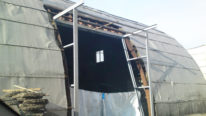 kaarhalli välispleki ja soojustuse (vene ajast pärit puitlaastplaadi ja klaasvilla) demontaaz.