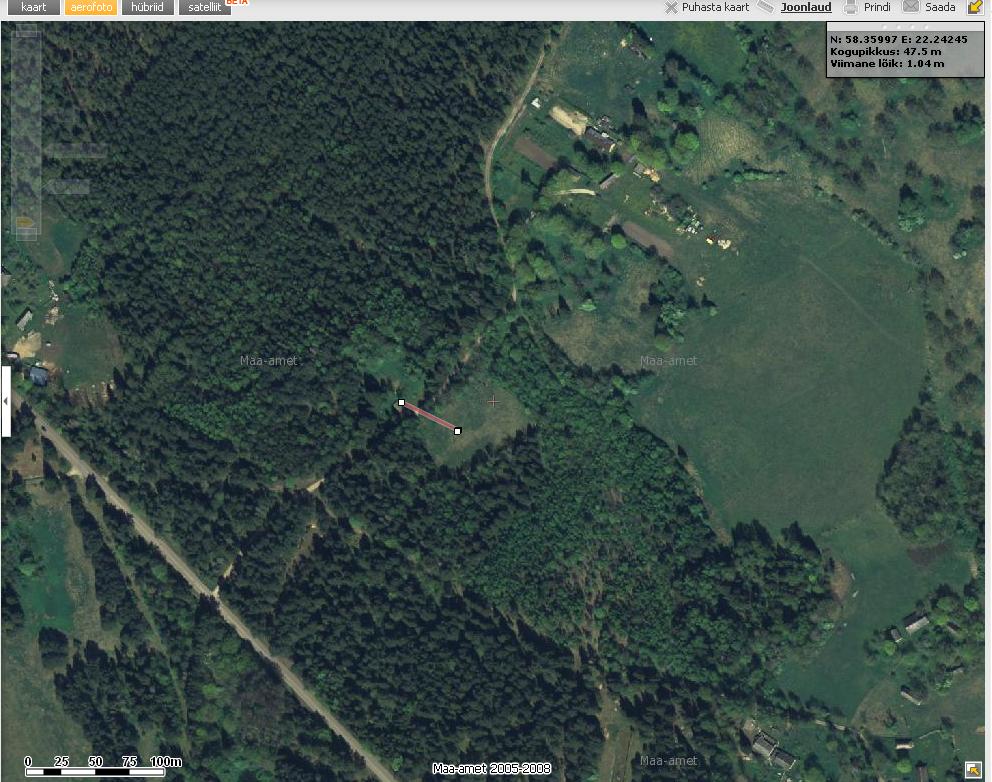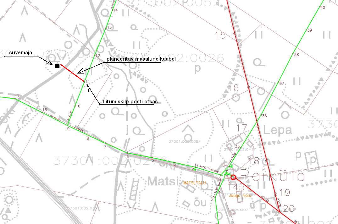 Lisas on kaart kus punasega on märgitud eeldatav maaalune liin el. postist kuni maja seinani, teekond viib läbi põllu ja grunttee, pikkus umbes 50 m