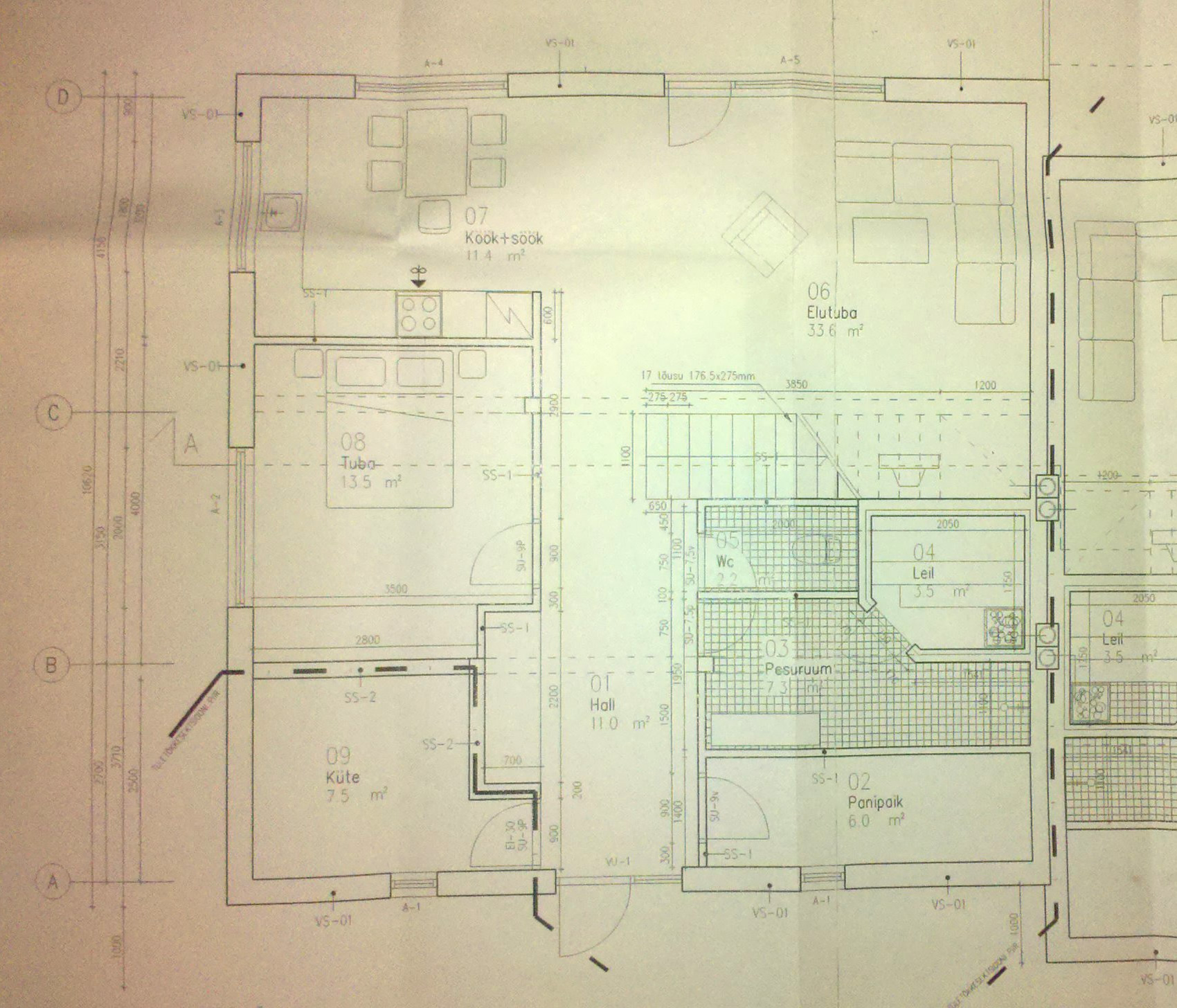 * Sama 1.k pesuruumis. Seal eelnevalt vaja vana plaat üles võtta (1/2 ulatuses pandud) sest tehtud ilma vuugivahedeta ning seejärel uuesti plaatida. Joonisel näidatud sauna hetkel ei tee, küll aga vajab paigaldamist sauna uks.