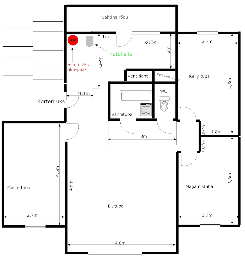 Tekitada tuleb eraldi korsten ja ava laepaneeli sisse (põhimõtteliselt on sellele tööle pakkuja olemas, kuid ootan ka teisi pakkumisi siit), kuna majal endal ainult ventialtsiooni ¨aht lõõridega. Majal viilkatus ca 2m katuseharjaga.