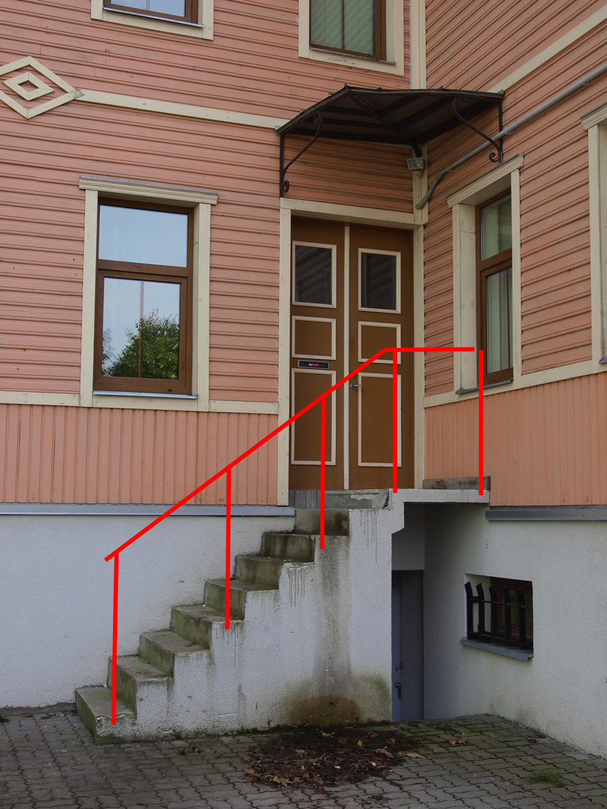 On vaja toota metallist käsipuu välistrepile, mis peab oma välimuselt kokku sobima välisuste kohal olevate varikatustega. Trepi pilt, käsipuu eskiis ning varikatuse konstruktsiooni pilt on lisatud hankele. Trepi käsipuu kõrgus trepi pinnast 850 - 900 mm. Käsipuu pikkus 3500mm, millest 800mm on horisontaalne osa ülemise platvormi servas ning 2700mm on astmete kõrval olev tõusev osa. Hinnapakkumine peab sisaldama eraldi ridadel: 1. materjalid + tootmine 2. transport ja paigaldus