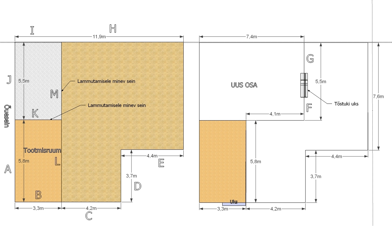 5. Uue ruumi õuepoolne sein mõõduga 11,3m x 2,6m tuleb soojustada (karkass+vill+kipsplaat). Joonisel seina A+J.