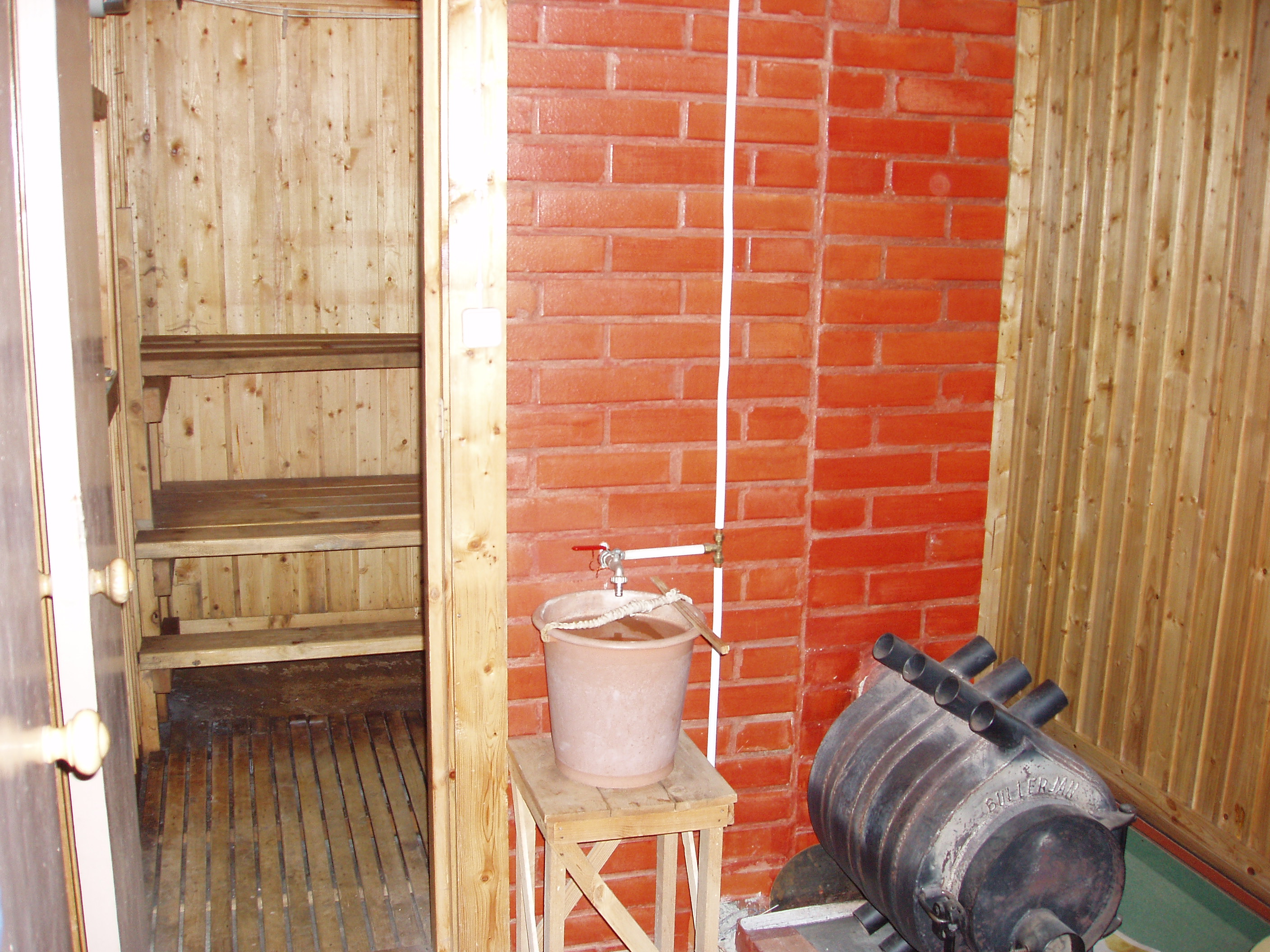 2. Saunaosas (pildil juurdeehitus maja küljes, netopind ca 15 m2) saunaruumi (ca 4 m2) lammutus ja ehitamine dushi-vannitoaks (lihtne vann, plaatimine, boiler, ventilaator suitsulõõri, el.põrandaküte) + tualetipoti asendamine ja ühendamine veesüsteemiga.