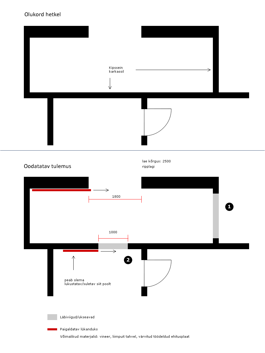 1 ukse lukustus, uksem66dud vastavalt kliendi joonisele ukseavade tegemine kyprocseina, sh. lisakarkass, palede viimistlus, l.pakud 2tk |