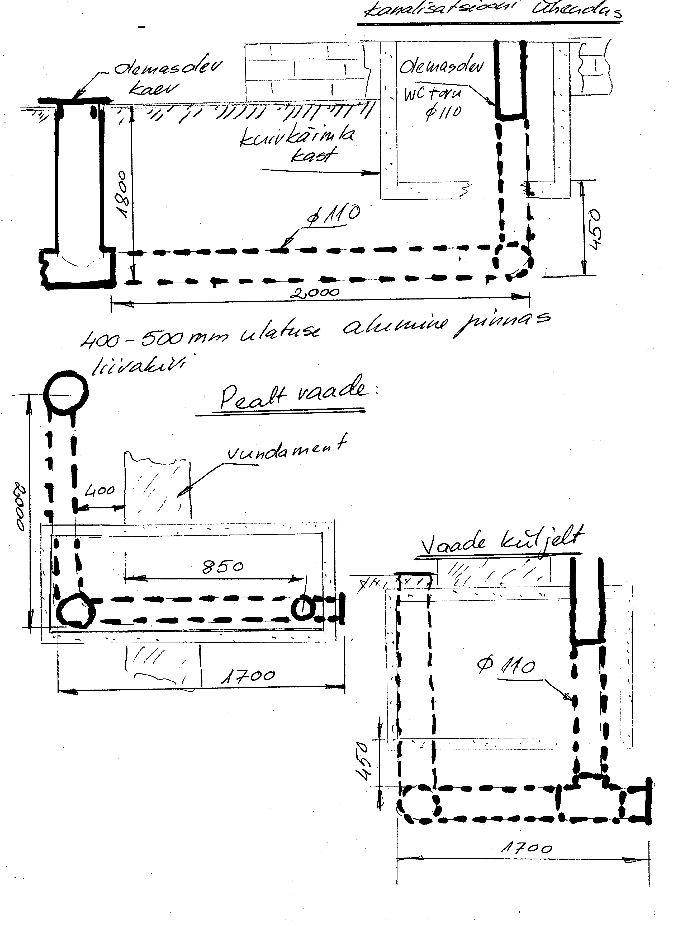 Maja kanalisatsiooni ühendamine linna kanalisatsiooni torustikuga, kaev asub 2m kaugusel majast väljuva kanalisatsiooniga, kuhu tuleb teha lisa kaev. WC ühendus tuleb teha lampkastist ja kanalisatsiooni toru tuleb 1,8m sügavusele maapinnast. Maapind 1,5m sügavuselt on liivakivi.
