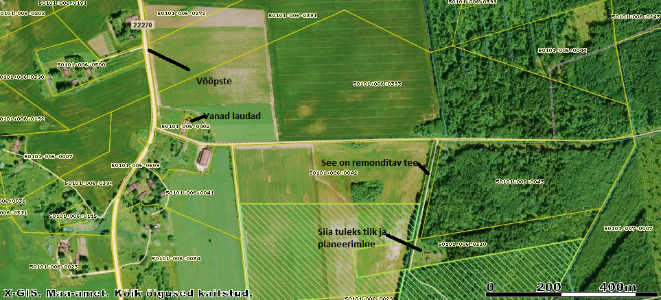 Olemasolev pinnastee, millele ca 10 a tagasi metsaveokid rööpad sisse sõitsid, oleks vaja katta kruusaga jm tööd vana talumaja ümber.