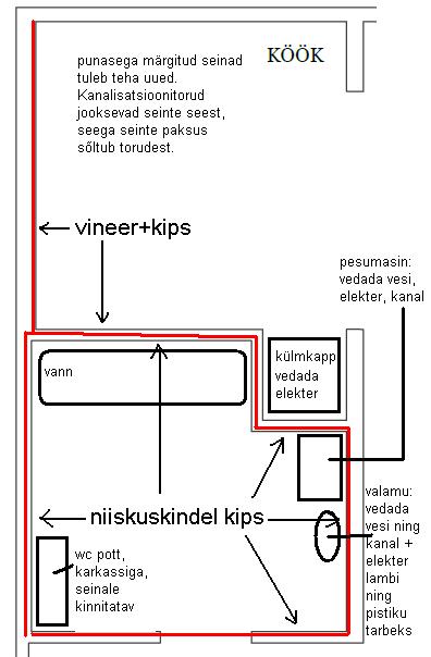 - Uued vannitoa seinad ehitada (kips, ~5jm) + köögi 1 sein uus (kips, ~2jm)