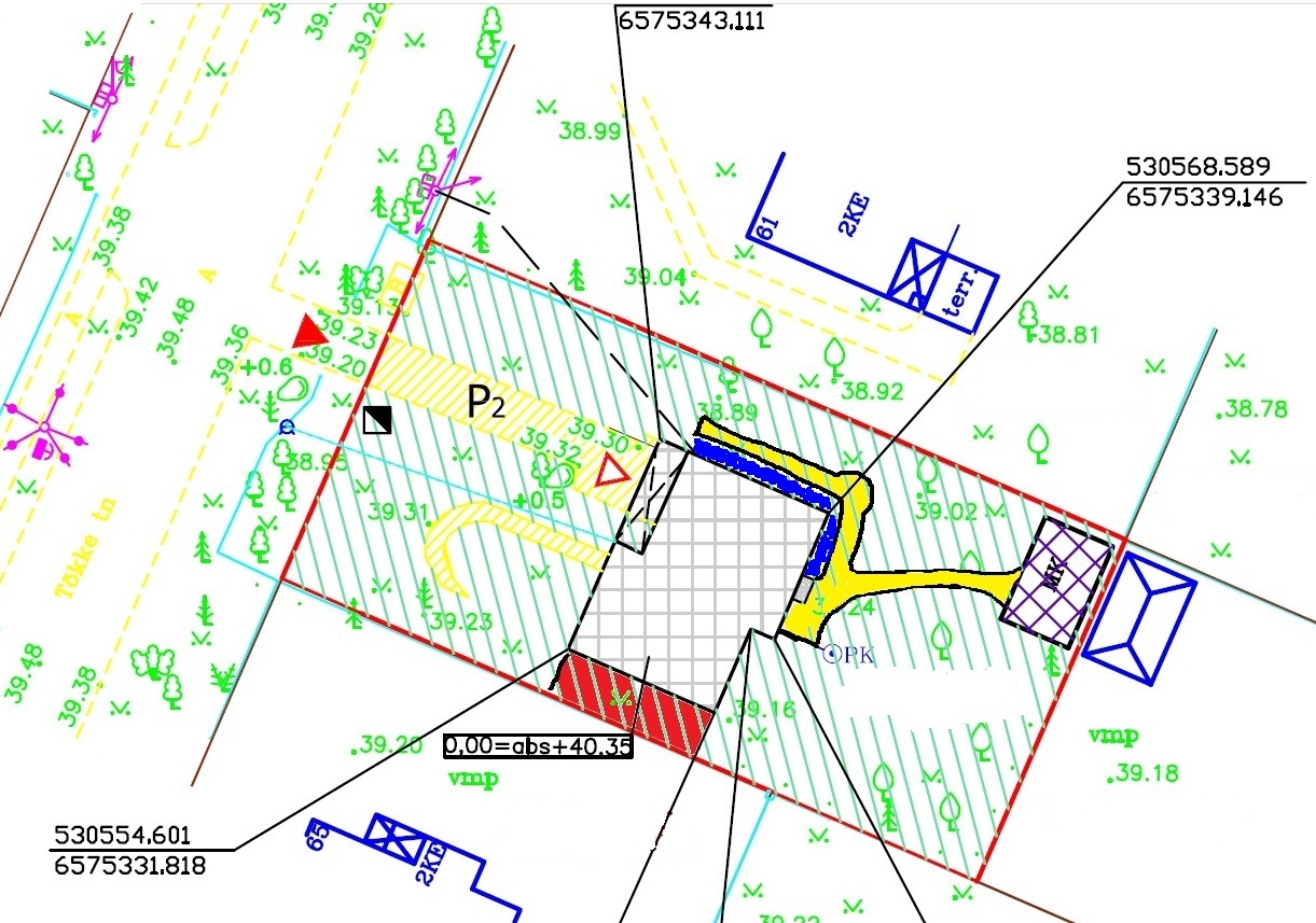 Maja kolmandasse külge (eraldiseisev, kaardil punane ala) tavaline hall kõnniteeplaat (30x30 või 40x40) + kummassegi otsa vihmavee juhtimise rennid. Äärekivi pole plaanitud.