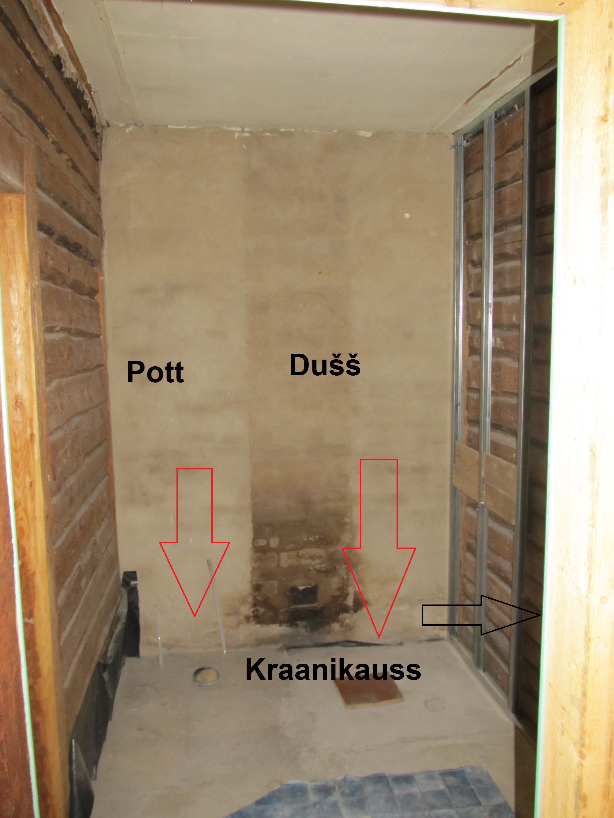 Ruum koosneb kahest osast, esialgu ehitab välja neist ühe - see on 170cm lai, 238cm pikk ning 258cm kõrge. Vasakus palkseinas asub ukseava (laius 98, kõrgus 202cm), mis viib edasi teise ruumiossa, kuhu hiljem tuleb vann. Paremas palkseinas asuv endine ukseava tuleb kinni ehitada.