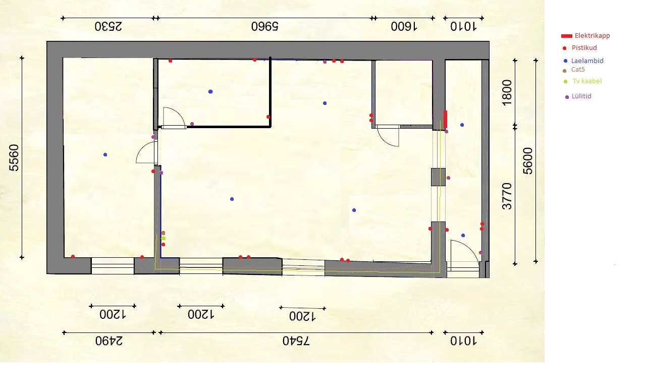 59,2 suuruses korteris vaja vedada elektrikaablid ja teha pistikupesad jm pesad. Vedada paneeli laelambi jaoks juhtmed (kokku 5 punkti), teha 2 veksellülitit.