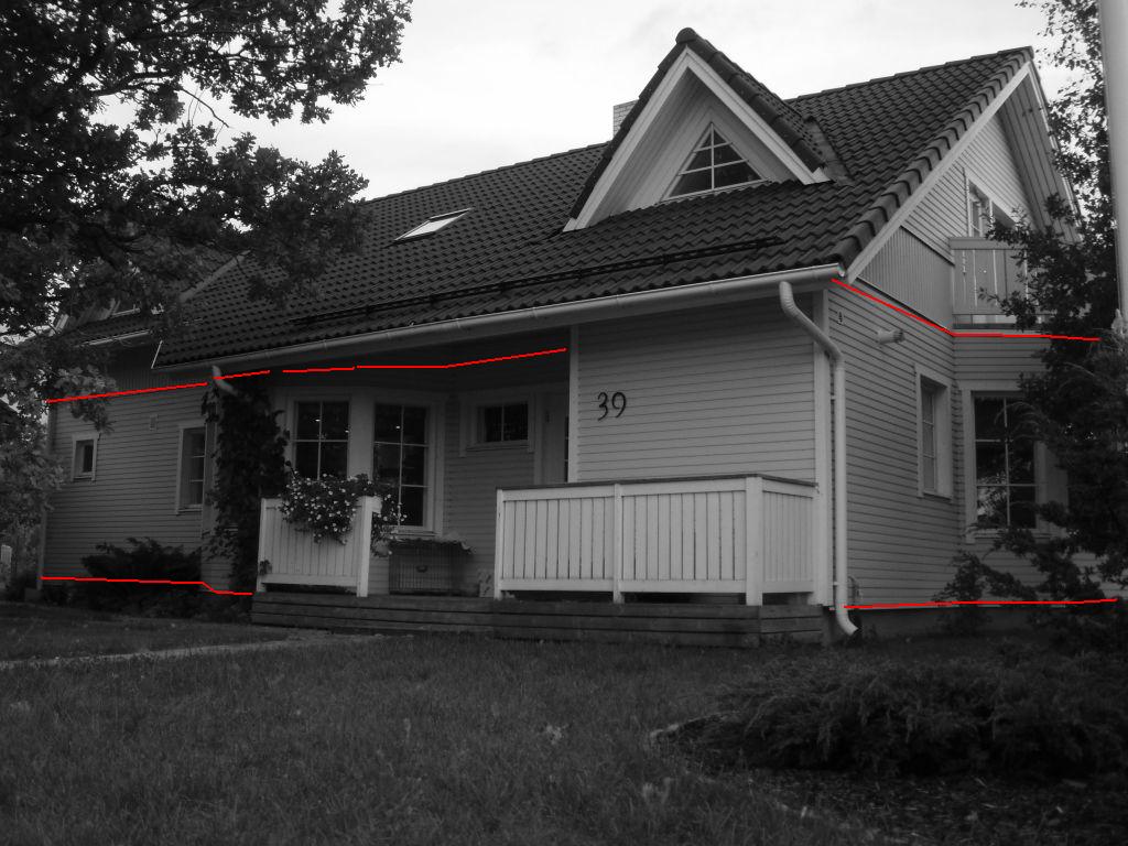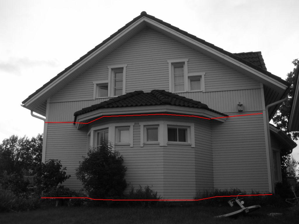 Tööde maht: vundamendi pealt ca 30m, vahelae peal ca 45m. Vöönd näidatud fotol punasega. Maja mõõtmed ca 14,5x8,5m