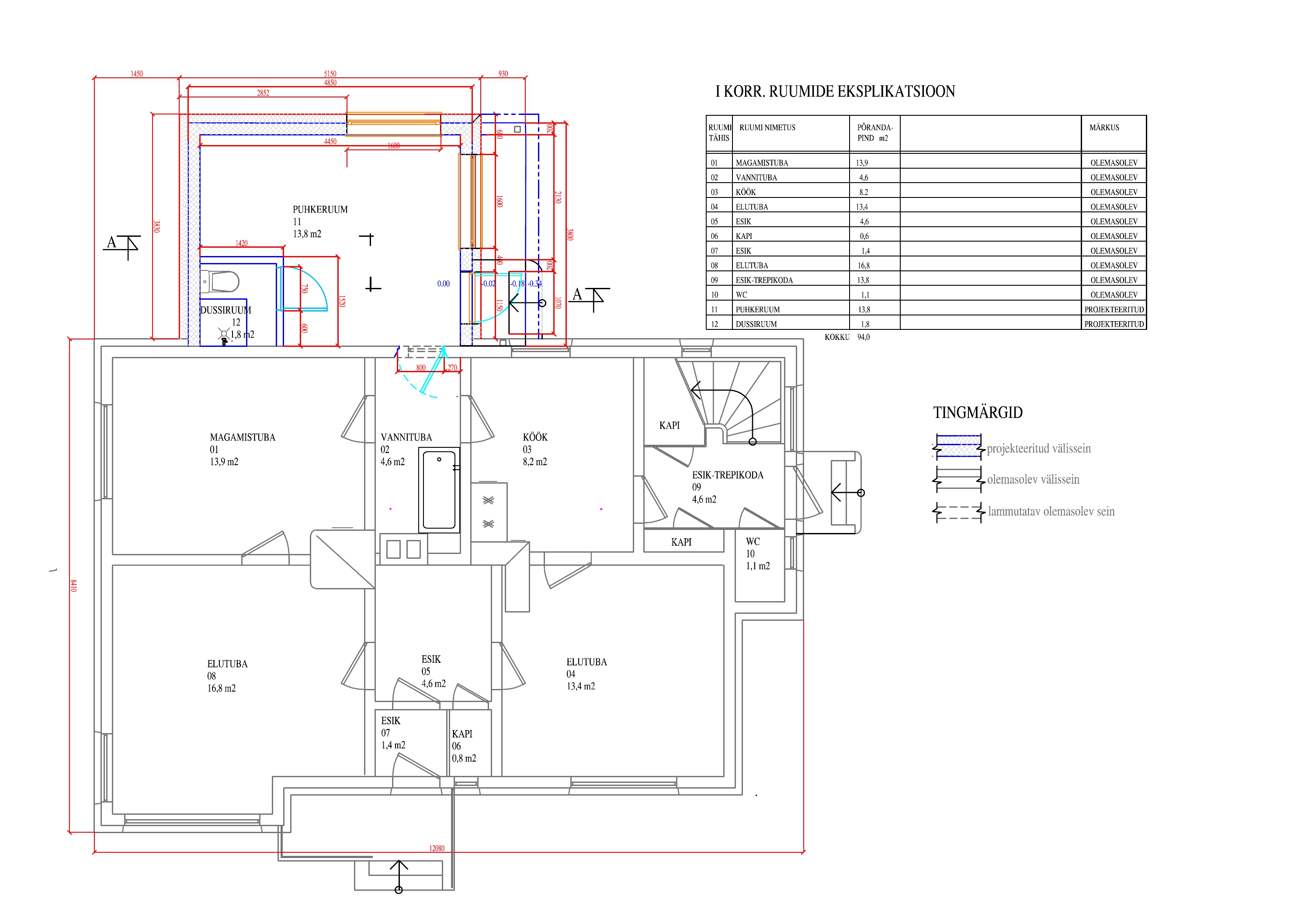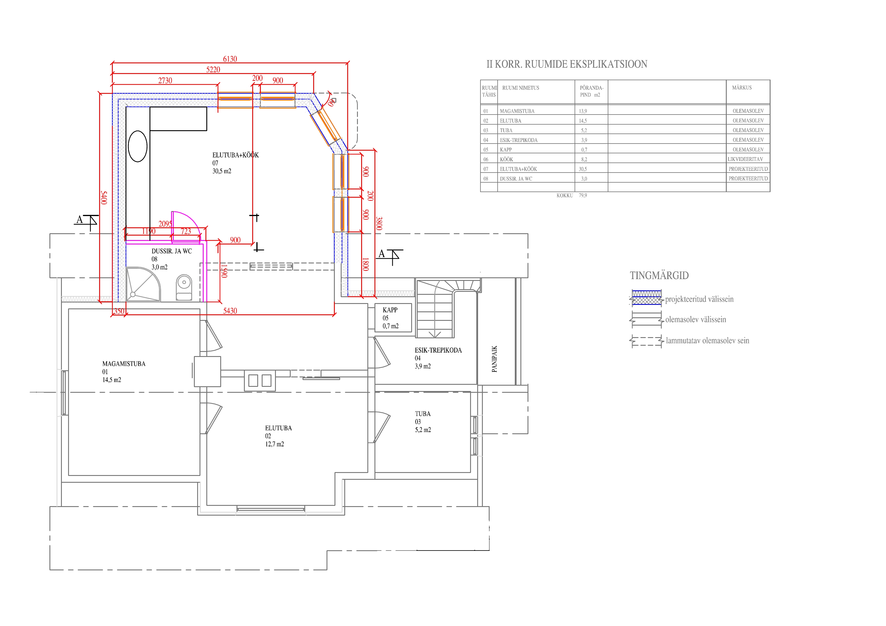- olemasolevate siseseinte lammutus (pääsuks juurdeehitatavasse ossa, täpsemalt näha 1. ja 2. korruse plaanilt)