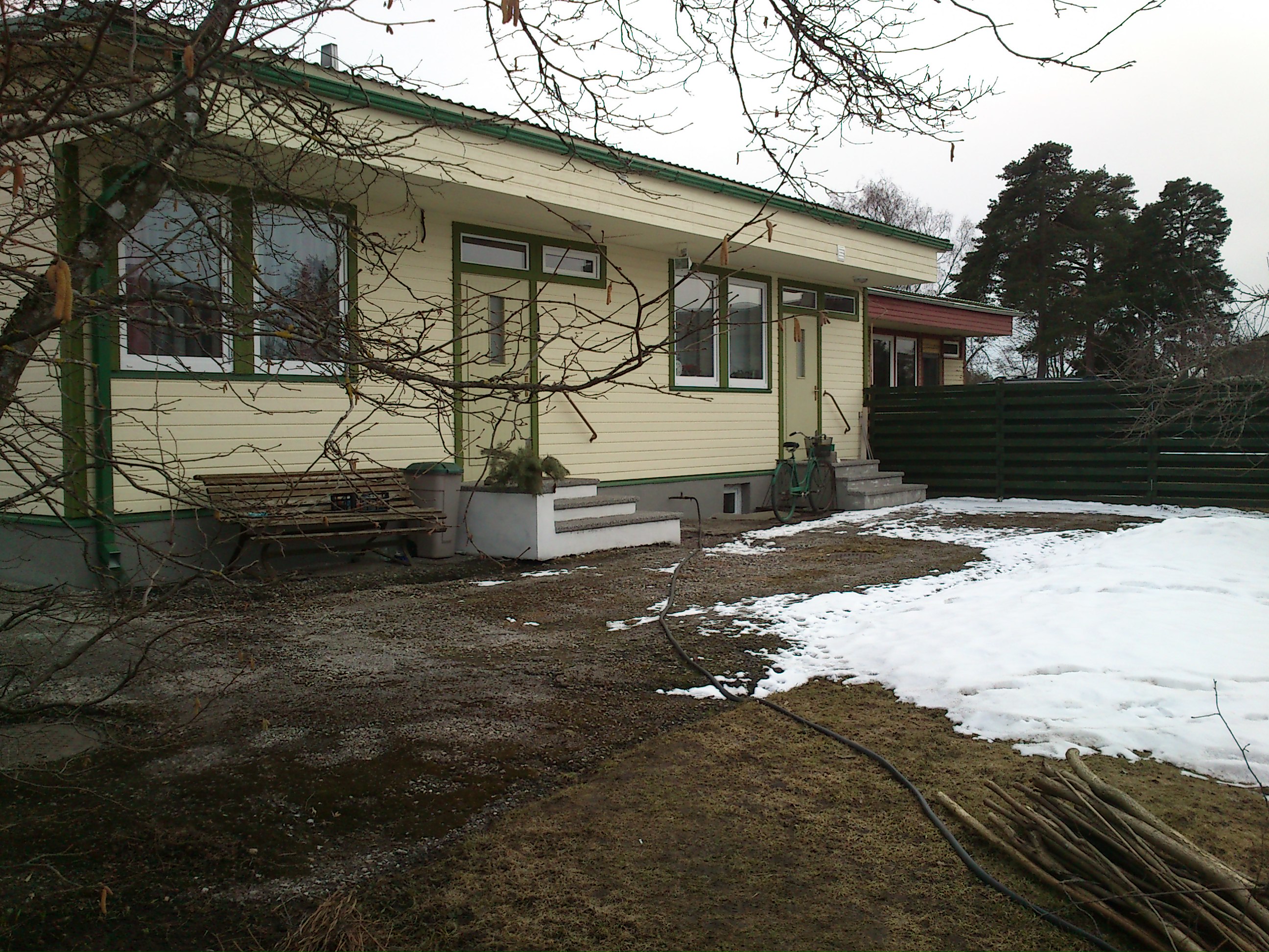 Soov on korrastada maja siseõu ja rajada õue viiv kõnnitee ning korrastada järgijääv ala. Täna on kogu plats kaetud 40 a vanuse asfaldiga, vundamendi ja trepi ääred avatud 10 cm. Kivi alla minevale alale jäävad kaks treppi, keldri aken, vihmaveetoru allajooks ja kanalisatsioonikaev. Kivi alla minev pind =47 ruutu so 4 m laiuselt vundamendist. Ülejäänud asfaldiga kaetud osast saab muru. Maja juurde viiv kõnnitee laiusega 1,3 m =29 ruutu. Ülejäänud osast saab muru, mille sisse jääb kanalisatsioonikaev, mis tuleb viia pinnasega samasse tasapinda. Haljastusele minev osa ~55 ruutu.