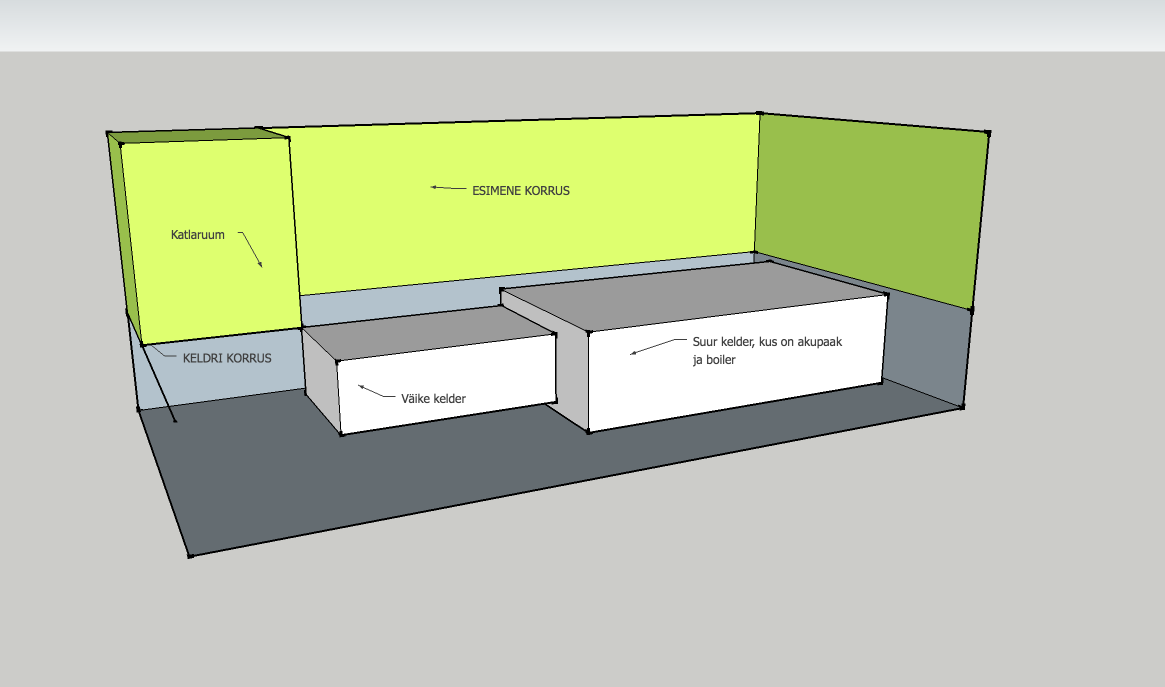 Nagu öeldud on akupaak ja boiler keldris, selle keldri mõõtmed on (3.8m x 2.2m x 1.6m (kõrgus)). Selle keldri ja katlaruumi vahele jääb ka teine kelder, mis on veel madalam (2.2m x 2.2m x 1.2m (kõrgus)). Katlaruum on esimesel korrusel, kõrguse vahe torule ~1.5m.