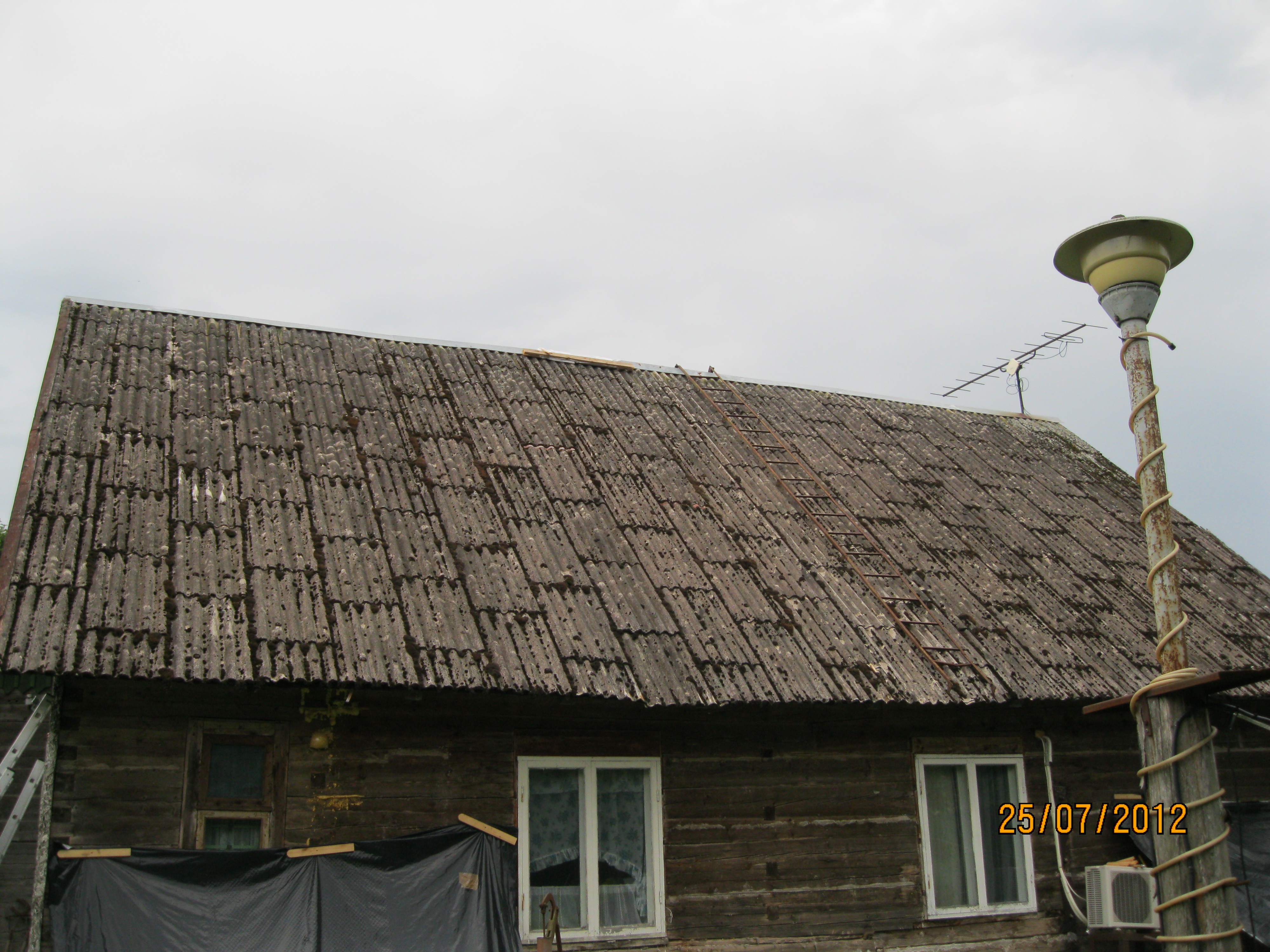 Vana katuse eemaldamine ja uue paigaldamine,Vana katus on eterniit ja selle all pilbas.