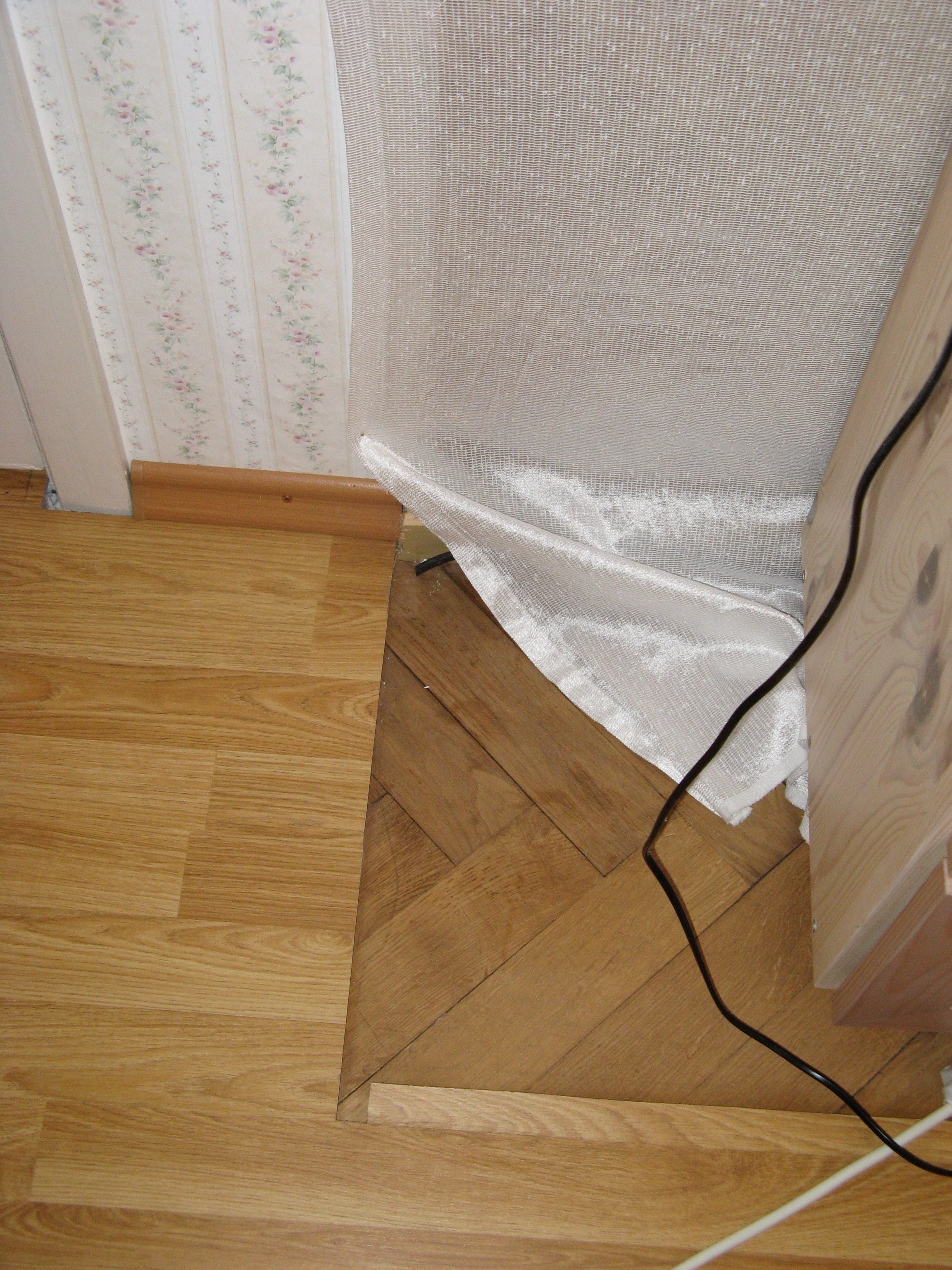 Hetkeolukord: tubades laminaatparkett, mille all on ehitamise-aegne kalasaba tamme-parkett, esikus ja köögis linoleum, mille all on must laud ning vannitoas plaadid.