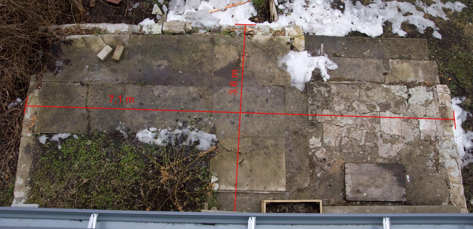 Vana terrassi (kivitäidis+betoonkate) 16,8 m2 asemele uus. Vana alus on vajunud, vaja lammutada ja ehitada uus. Lammutustööde hind tuua välja eraldi (hankele võib vastata ka ilma lammutustööde pakkumiseta).