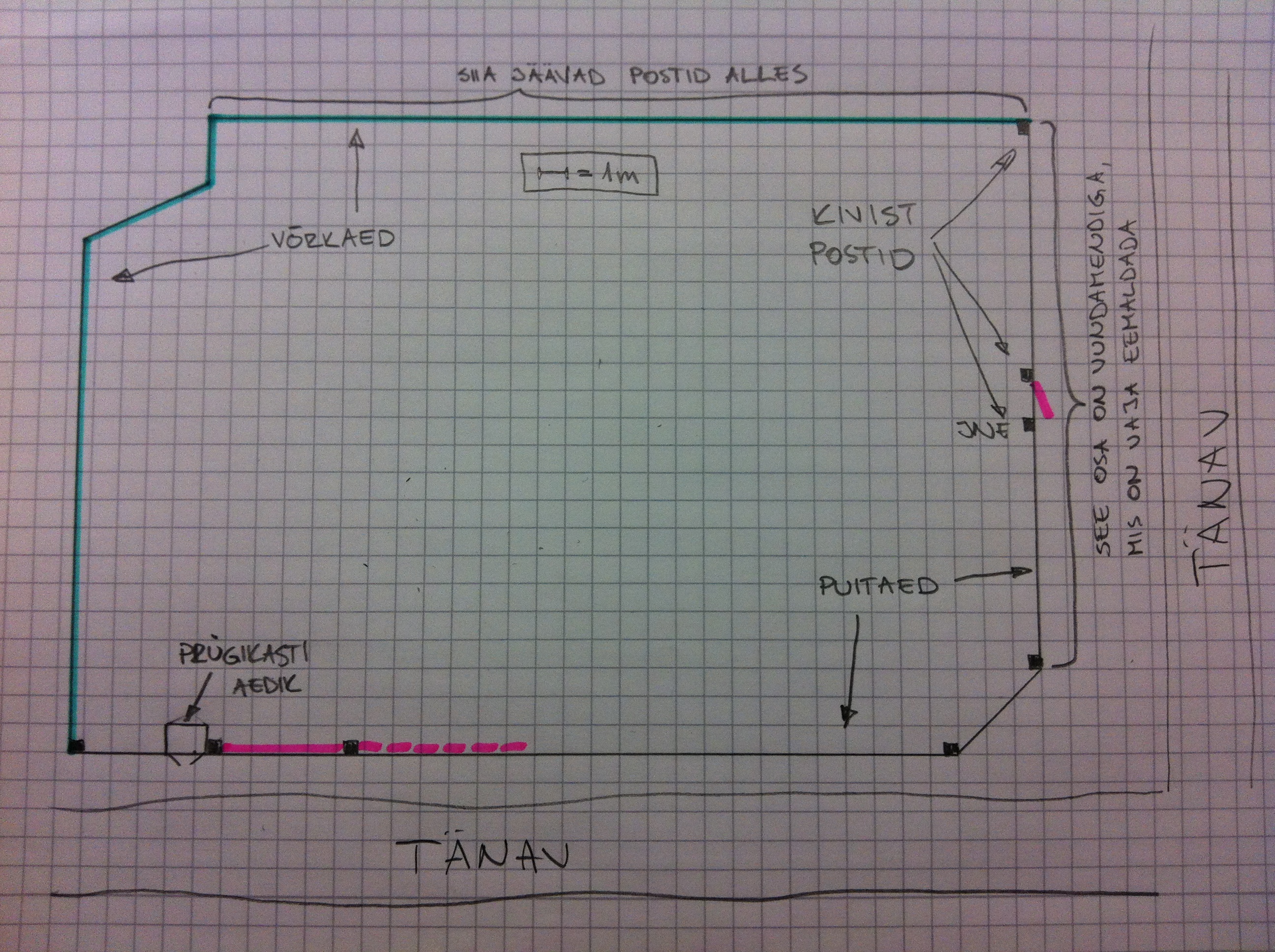 • Vana aia demonteerimine ja äraviimine. Demonteerida on vaja 20m valatud vundamendiga aeda ja ülejäänud on valatud betoonpostidega aed. 30 m ulatuses pole vaja poste demonteerida, sest need jäävad kasutusse.