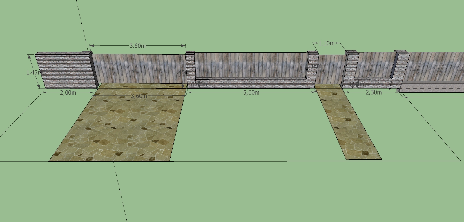 Esiaed jaguneb praegugu kaheks osaks. 16m on lippaed ja 14m on müür milles jalgvärav ja autovärav.