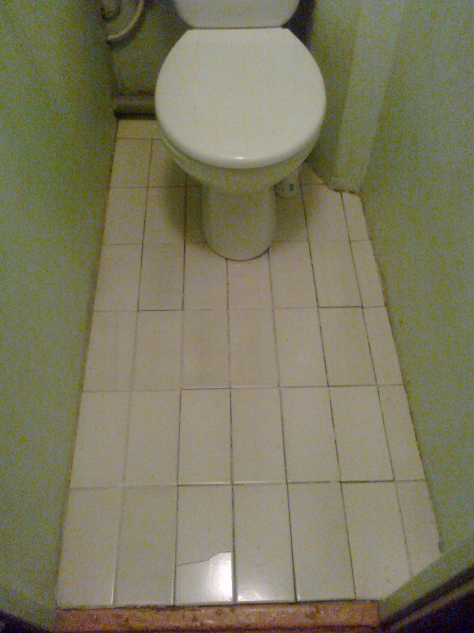 Korterelamu WC põrandaplaatide kinnitamine. Peaaegu kõik plaadid on lahtilogisenud, sest WC-poti põrandakinnituse 1 kruvi on katki. Põranda tagumine serv (10 cm) on halvasti tehtud ja vajab uut lahendust. Põrandapind 70 cm x 1,50. Tagumine osa kitsam püstaku torude tõttu