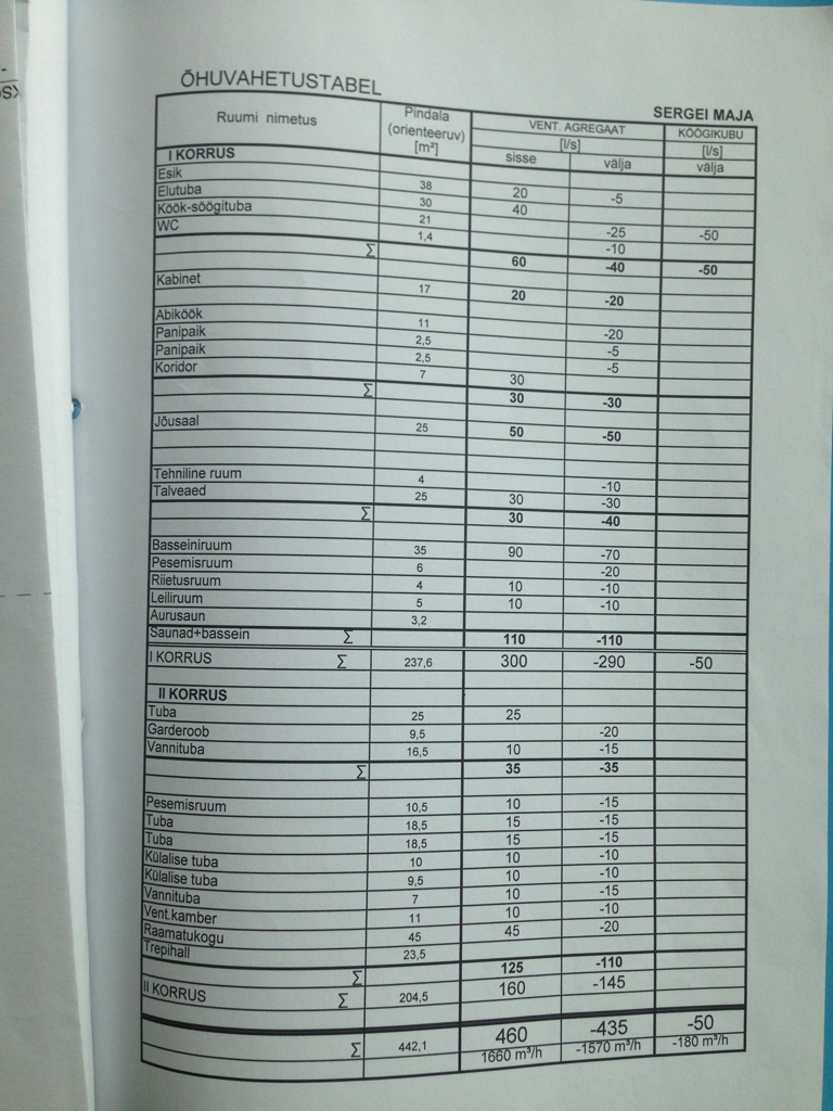 On vaja pakkumist ventilatsioonisüsteemile (projekt on olemas). Hetkel on lõpetatud 90% torudes, tegemata ja valimata on vaid ventagregaat, on vaja teha sisse ja väljatõmbe torusid ning ehitada ühendusi ventagregaadiga ruumis kus ta hakkab paiknema. Projekt näeb ette et ventagregaat saaks sisse 460 l/s ja väja - 435 l/s ehk siis vastavalt 1,660 m3/t ja 1,570 m3/t. Kuna eramus on ettenähtud bassein siis süsteem peaks seda toetama (basseiniruumi üldpind on 35m2). Soojusvaheti peaks töötama veega (ühendus on tehtud, vesi tuleb maasoojuspubmast). Süsteem peaks olema võimeline jahutada õhku suvel kui see omadus on mõistliku hinnaga.