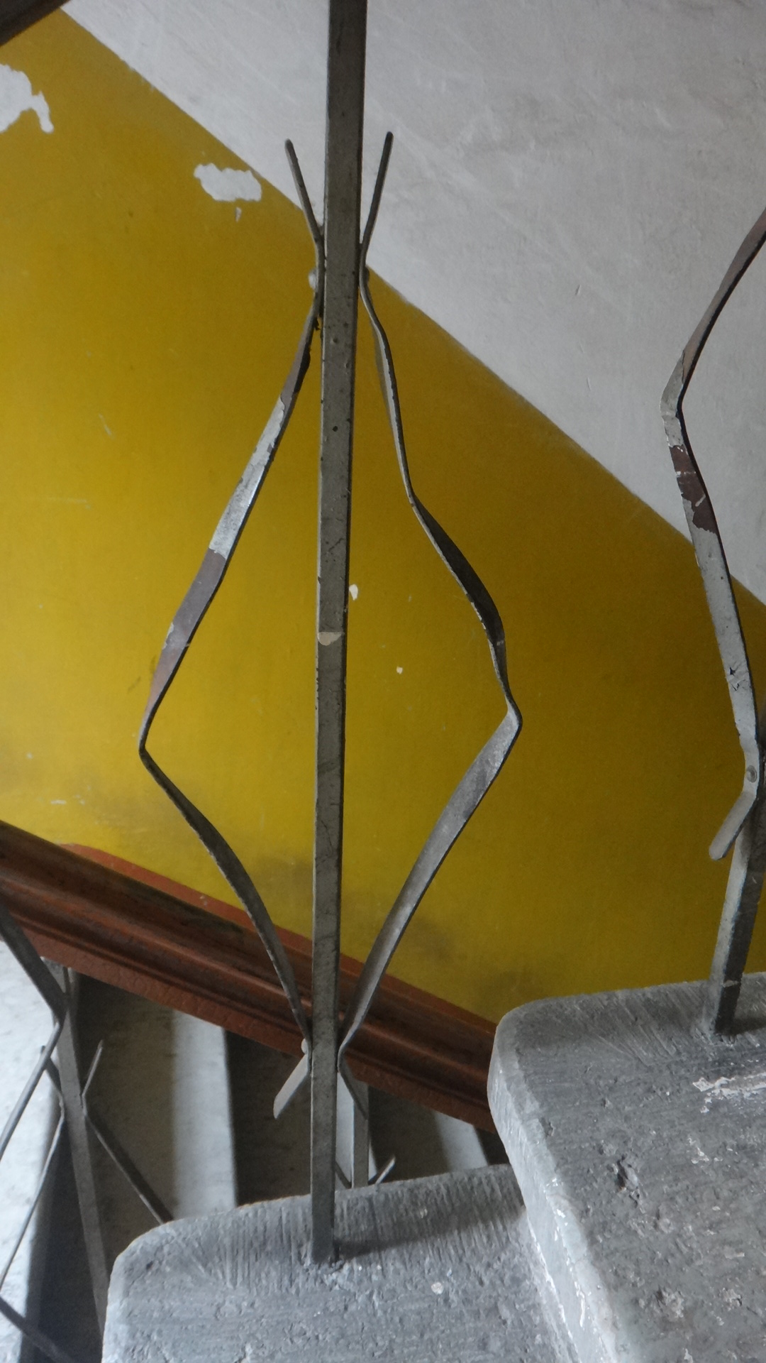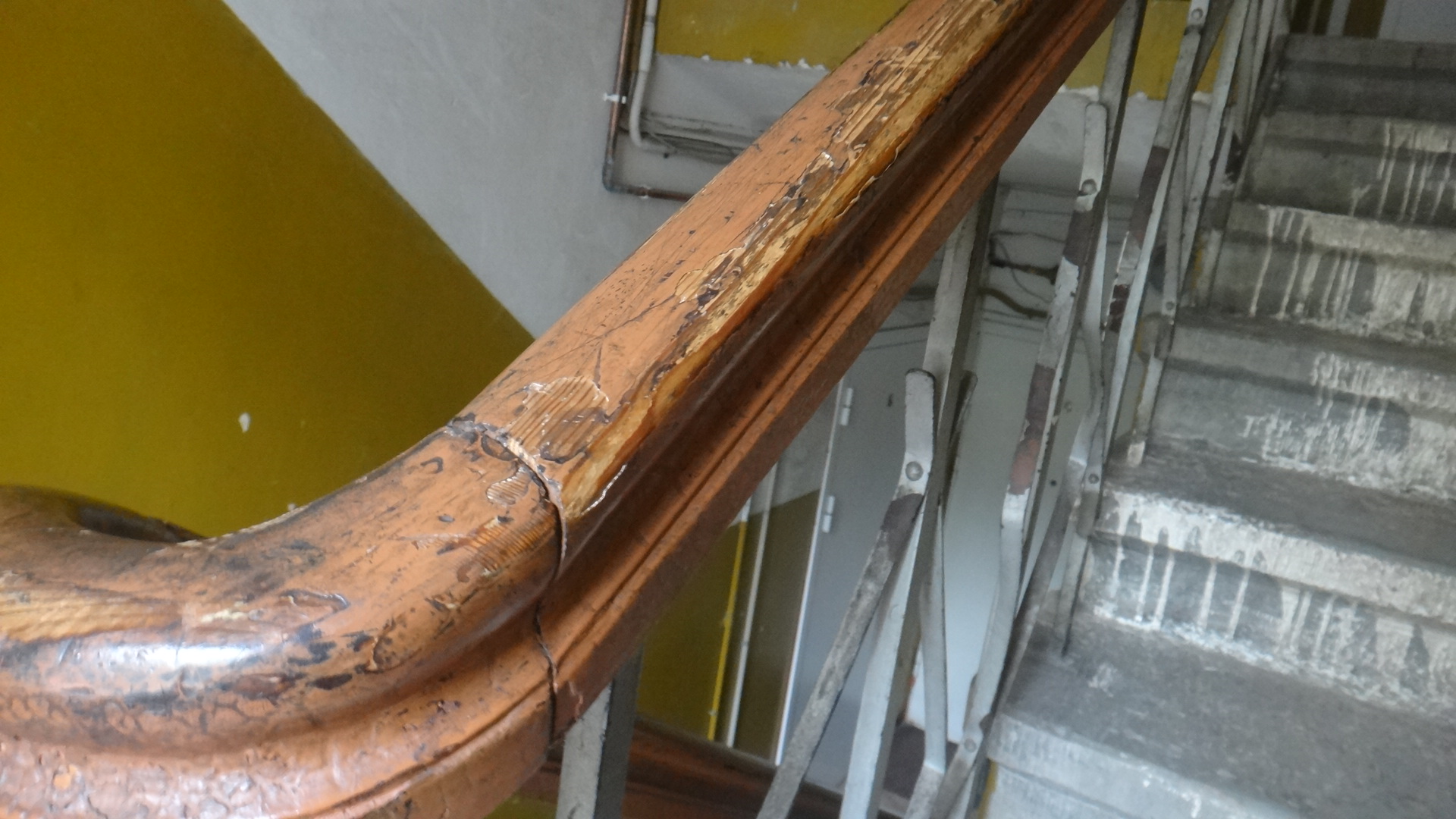 Trepikäsipuude puitosade värv on maha kulunud ja kohati on puitu mehhaaniliselt kahjustatud. Trepikäsipuude metallkonstruktsioonide kandevosa on terve ja korras, kuid ehisdetailidena kasutatud metallliistudest puuduvad või on kahjustatud 18 tükki (9 paari)