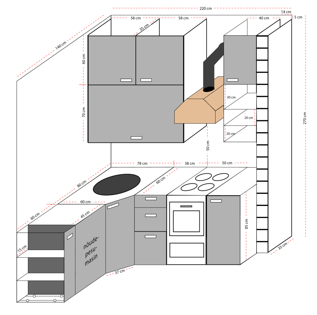 Tegemist on üsna väikese köögiga, kus ruumi peaks targalt kasutama. Mõtlesime välja üsna detailse plaani, aga hetkel paistab, et kraanikausi ala võtab natuke ebaproportsionaalselt palju ruumi. Kui selle koha pealt mõni kaval ettepanek on välja pakkuda, on see teretulnud.