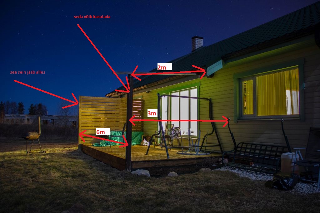 Terass on 3*6m ja katuse servast terassi ääreni on 2m
