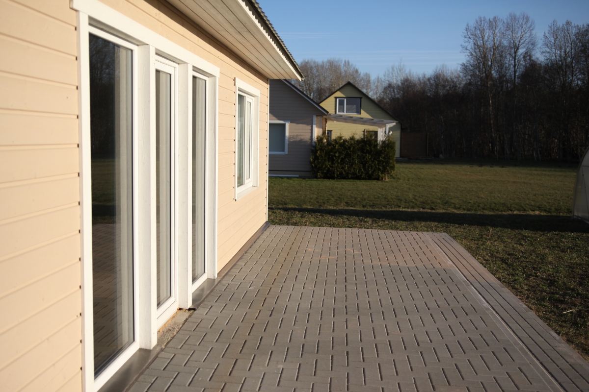 Terrass on laotud tänavakividest ja puidust postide jaoks oleks vaja paigaldada ka ankrud Mitu ankrut vaja, see oleneb mitut tugisammast antud suurusega varikatus vajab. Maja katus on madal ja varikatuse kalle tuleb seetõttu väike.