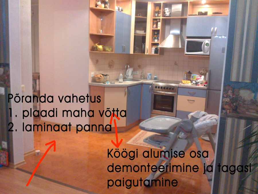2. Võtta köögil plaadi ära ja panna samasugust laminaadi nagu elutoas. Selleks on vaja kööki alumist osa demonteerida ja pärast tagasi panna (vt pilte).