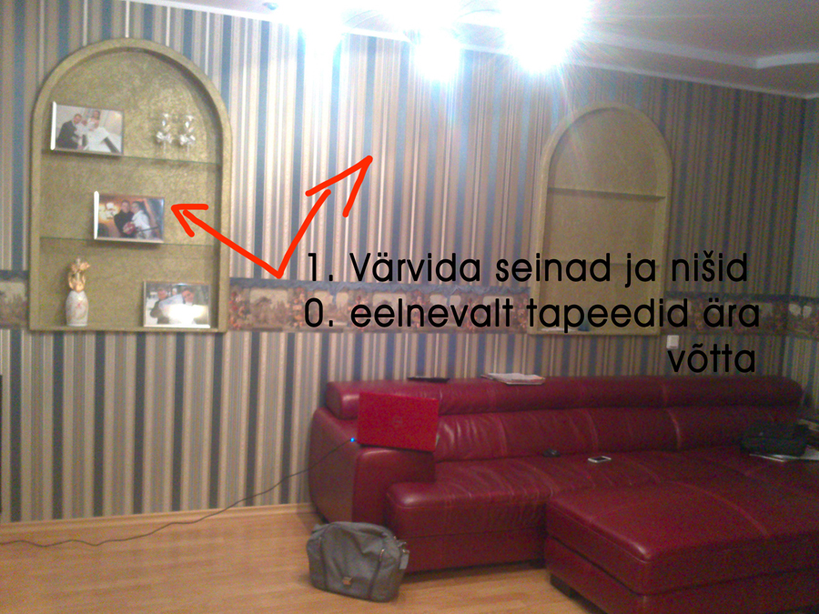 1. Tapeedi maha võtta ja värvida seinad + nišid (vt pilte).