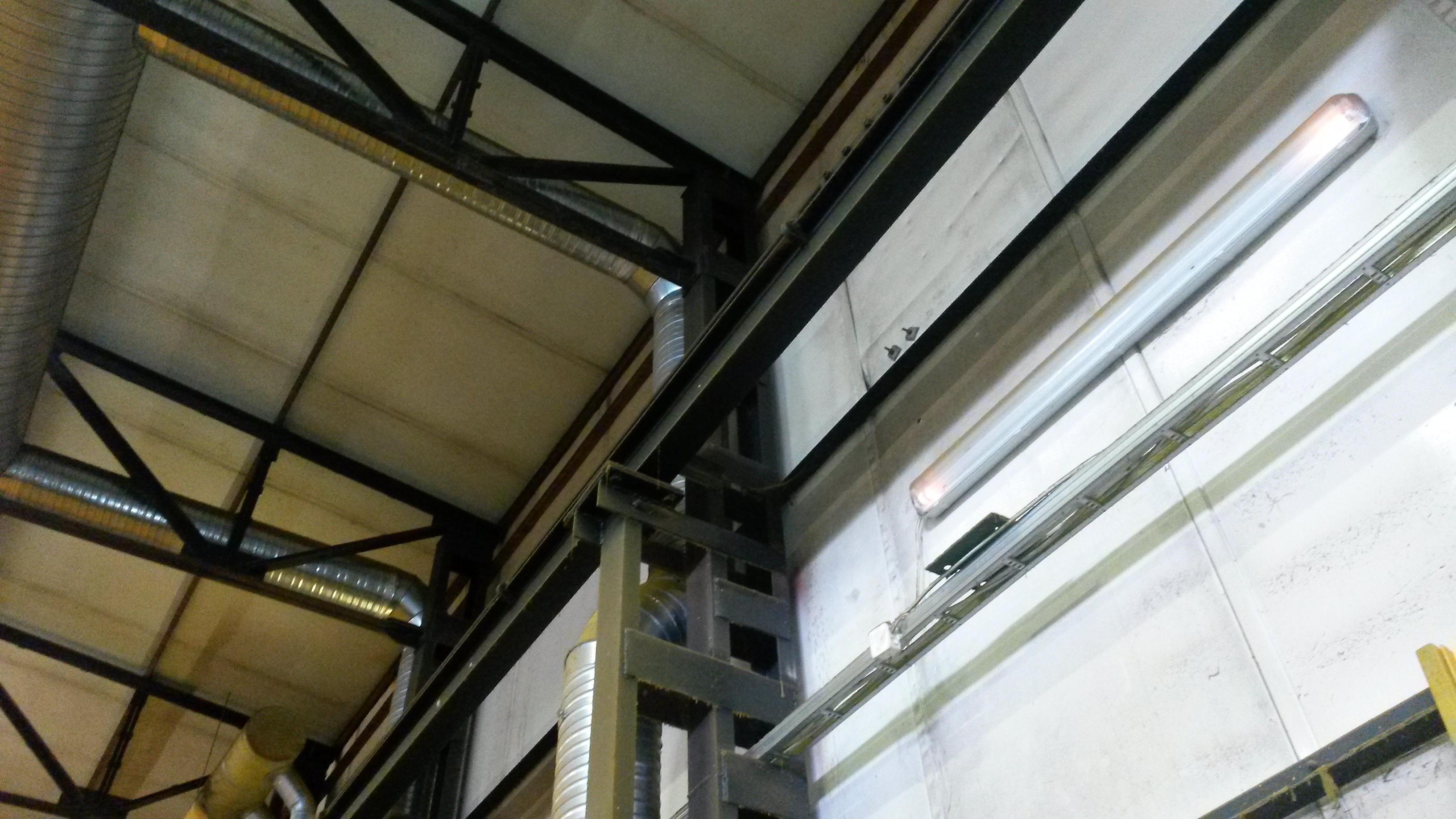 2.Elektrijuhtmestiku demontaaz. Laes on valgustid ja juhtmed. Postide küljes pistikupesad. Mõlemal pool piki seina kulgevad postide vahelt läbi kaabliredelid.