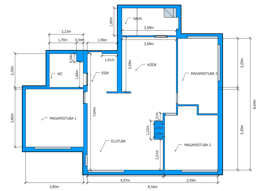- värvida kõikide ruumide seinad ja laed (magamistoas 2 on vaja eelnevalt eemaldada tapeet, teised toad on värvitud).