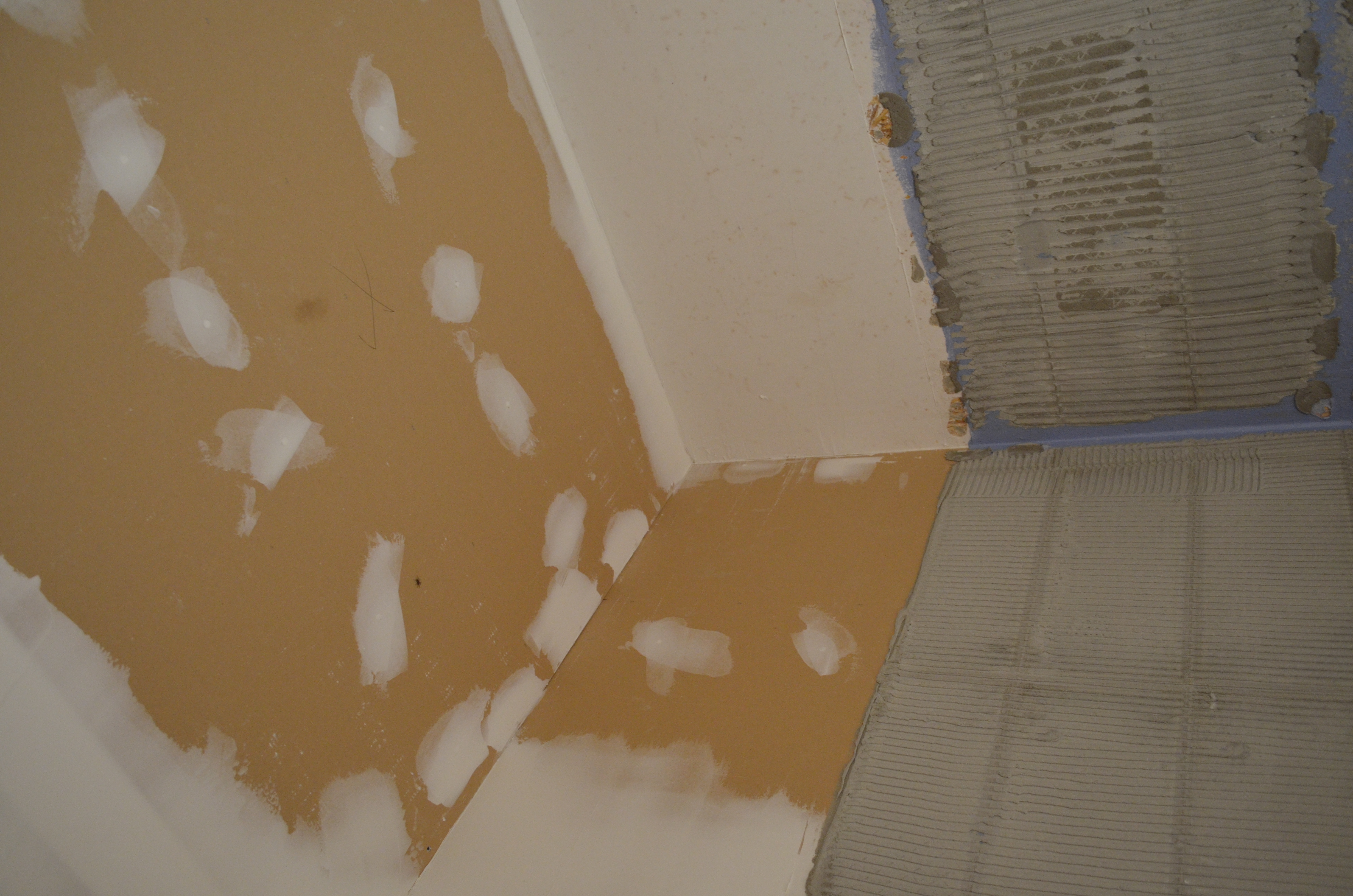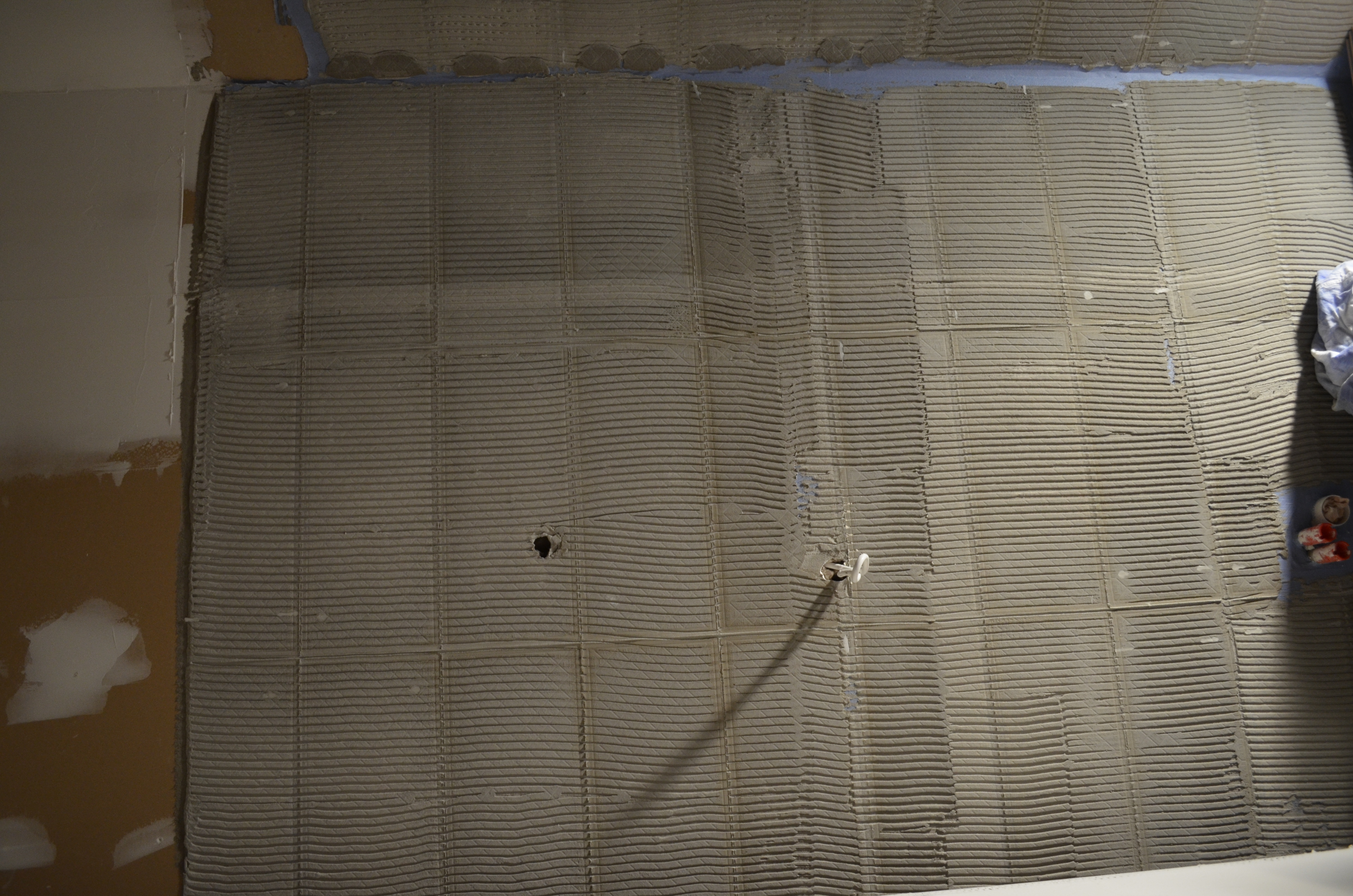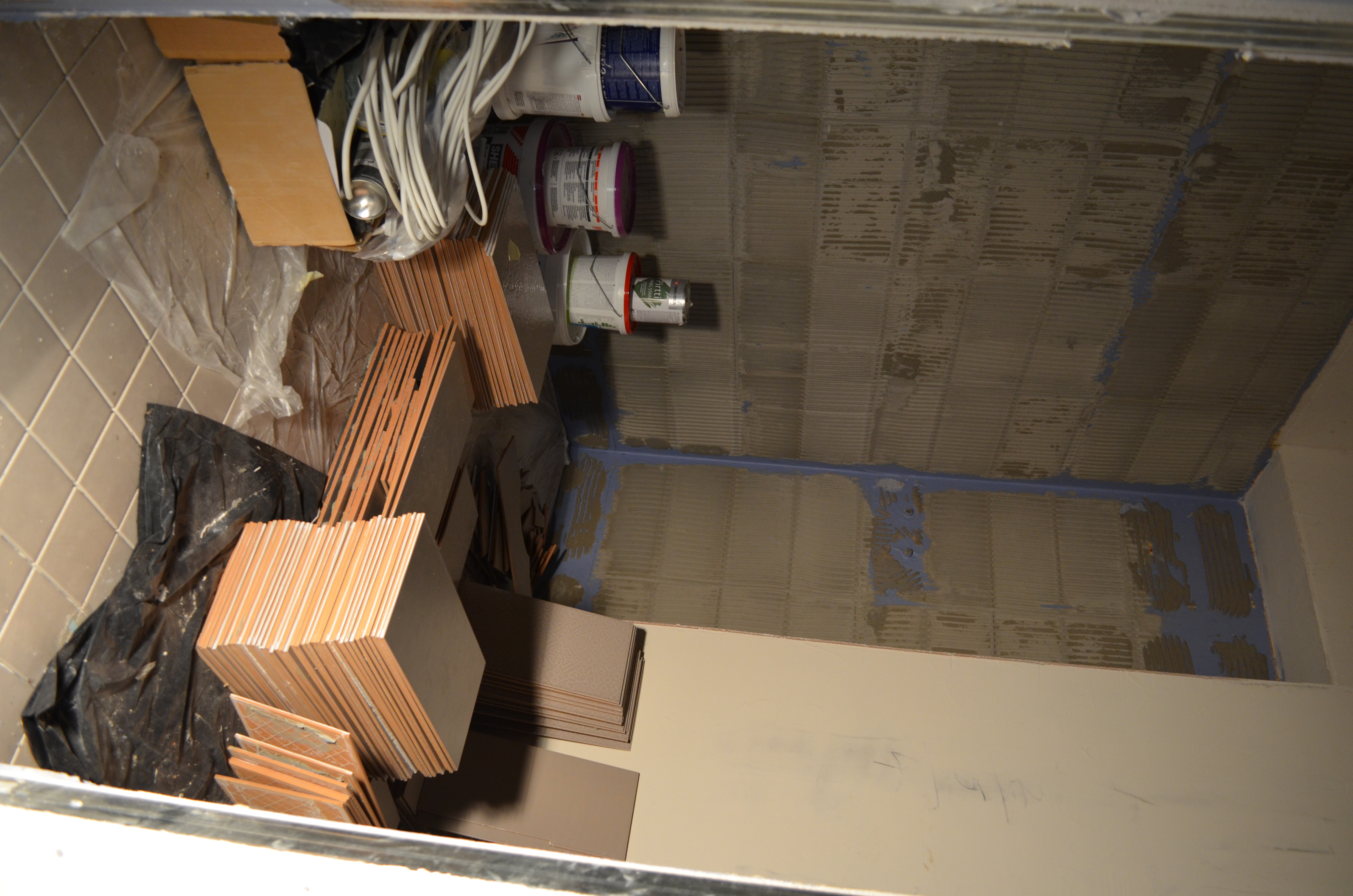 Tööd on pooleli, sest eelmisel "plaatijal" kukkusid plaadid seinast maha ja plaatimissegu on seinas. Vannituba vajab seetõttu pinna krohvimist ja tasandamist.