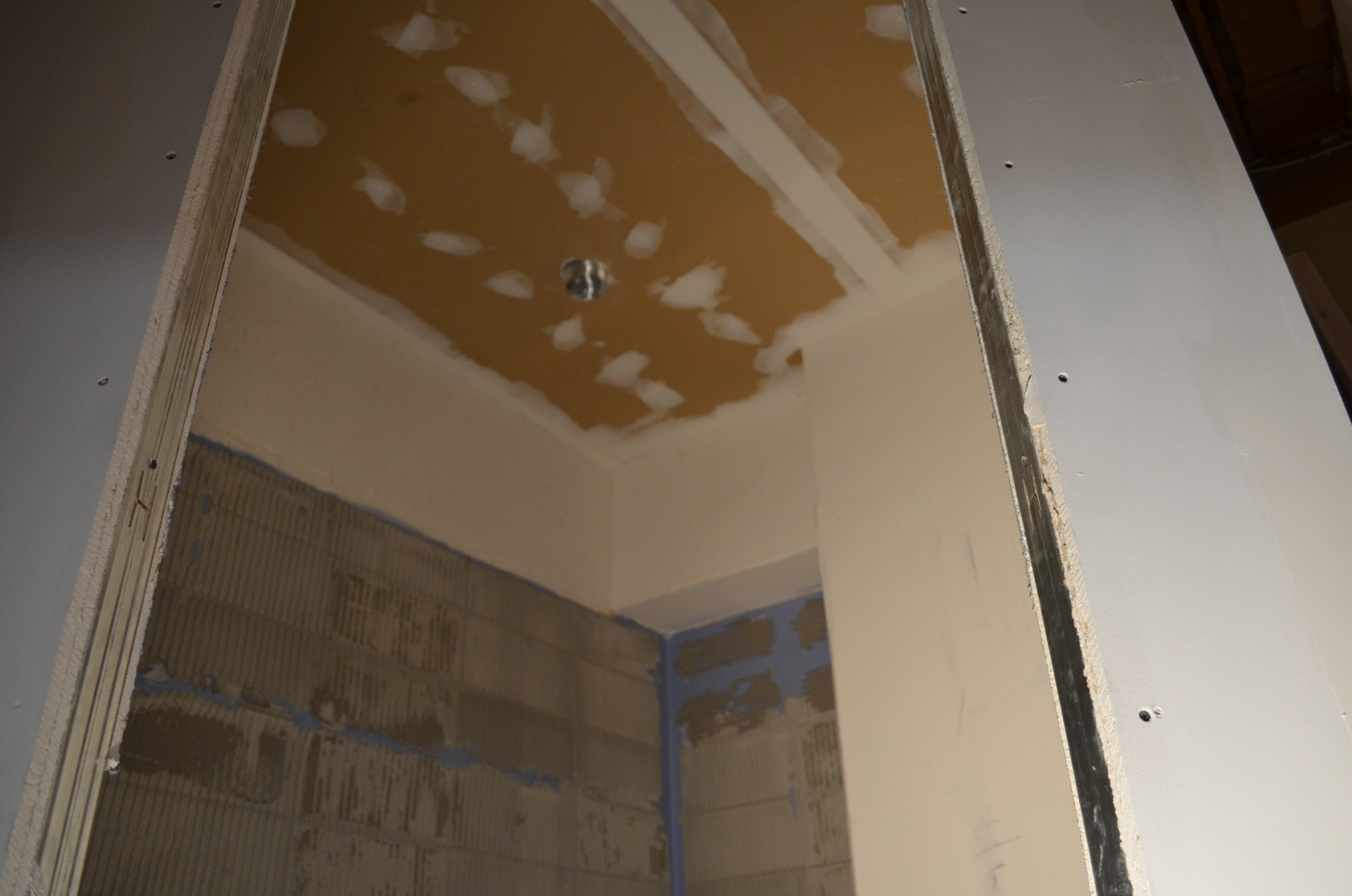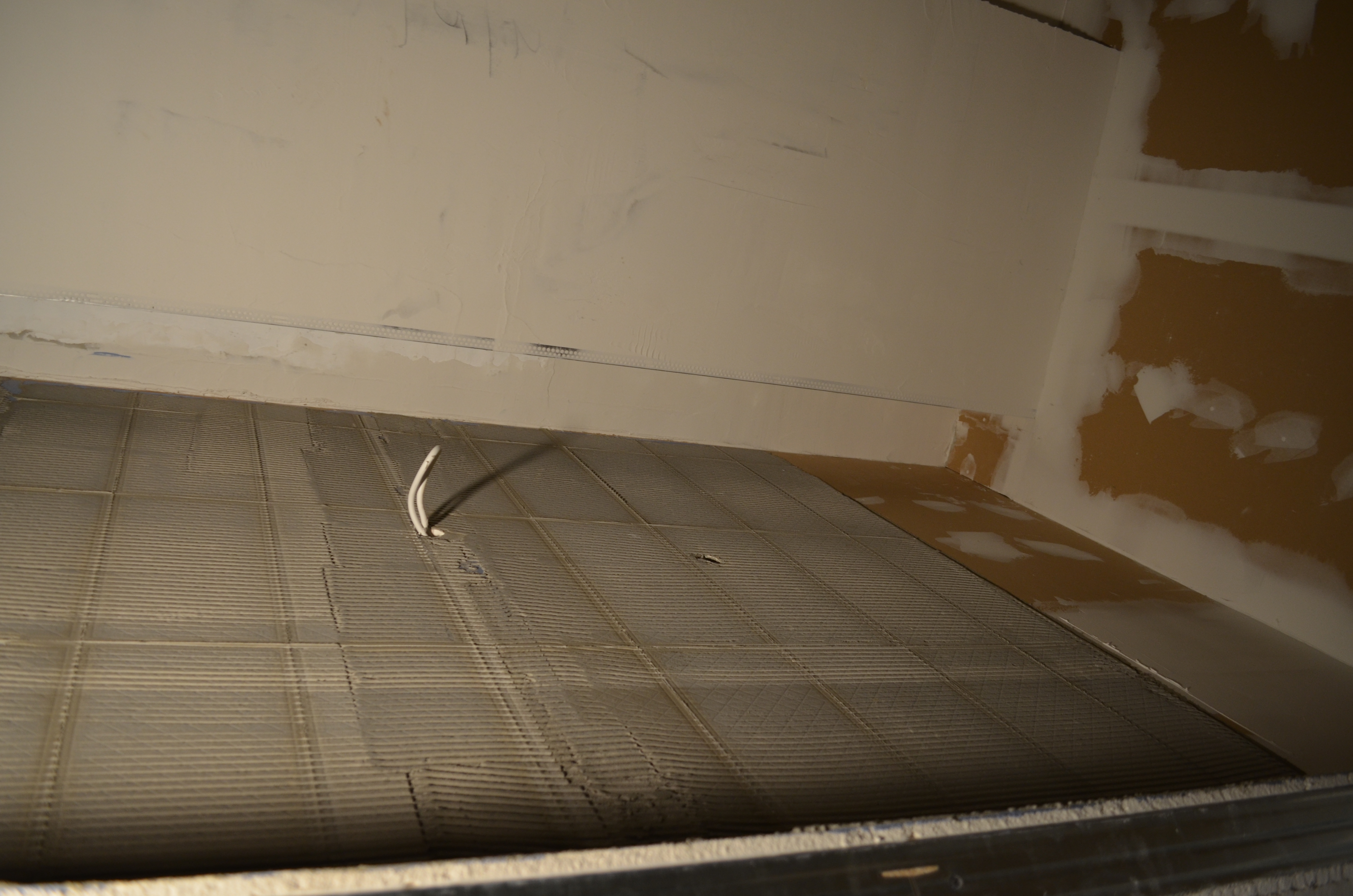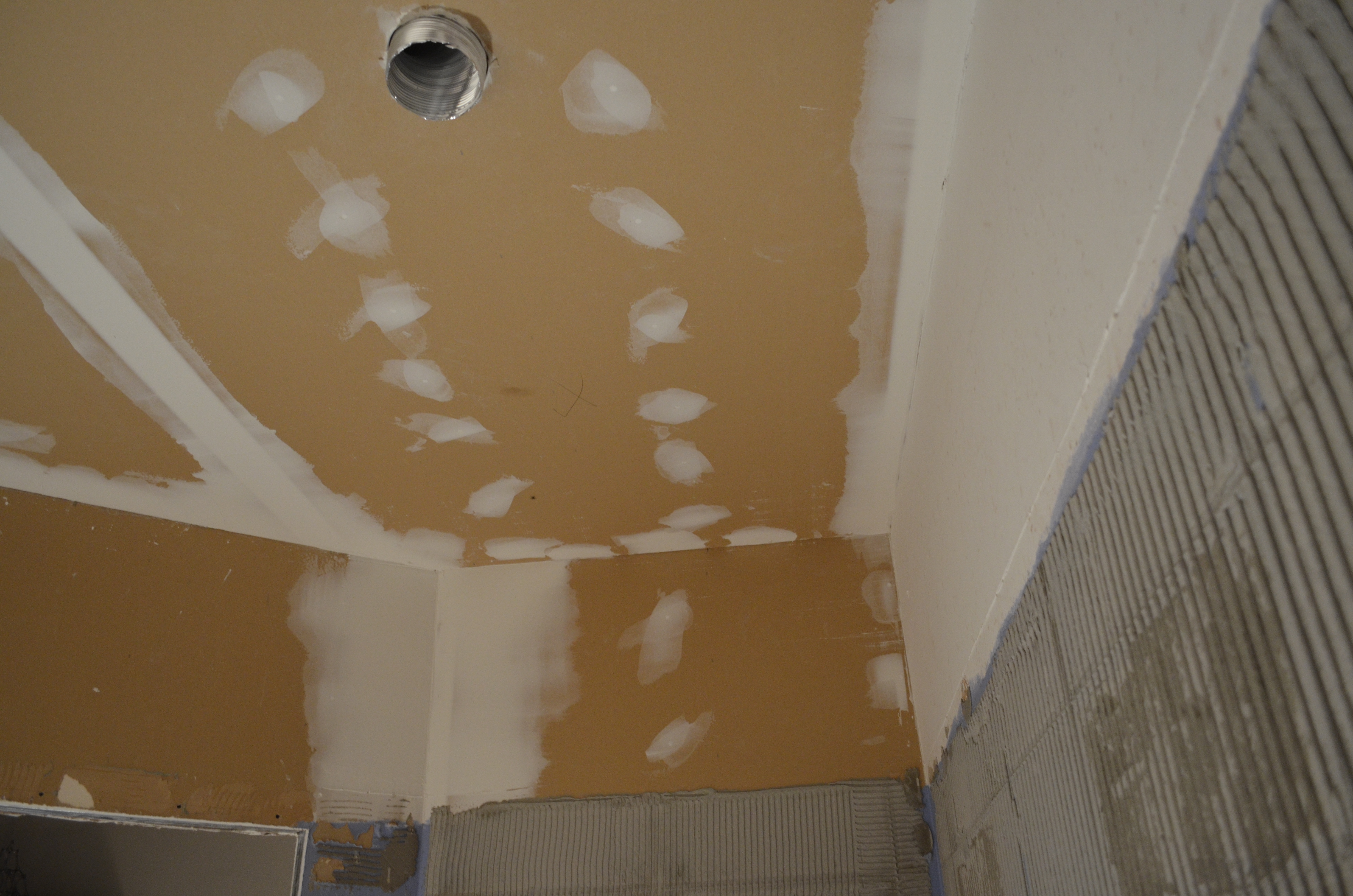 Tööd on pooleli, sest eelmisel "plaatijal" kukkusid plaadid seinast maha ja plaatimissegu on seinas. Vannituba vajab seetõttu pinna krohvimist ja tasandamist.