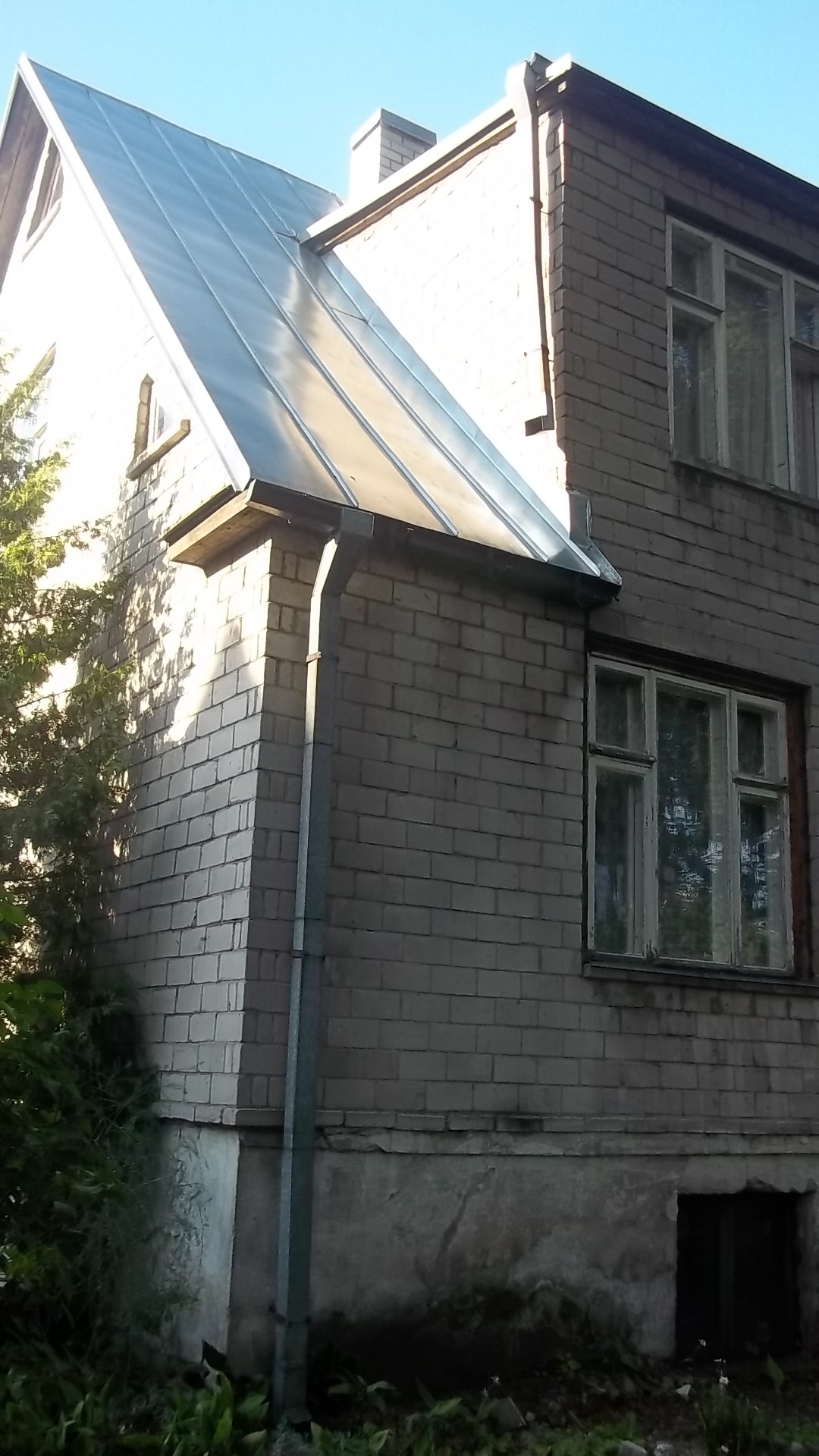 Kahekorruselise maja katuse kahe nurga kandiliste vihmaveerennide ja torude taaspaigaldamine, ning teise korruse ühe kahepoolse ja 2 kolmepoolse akna vihmaveeplekkide taaspaigaldamine.