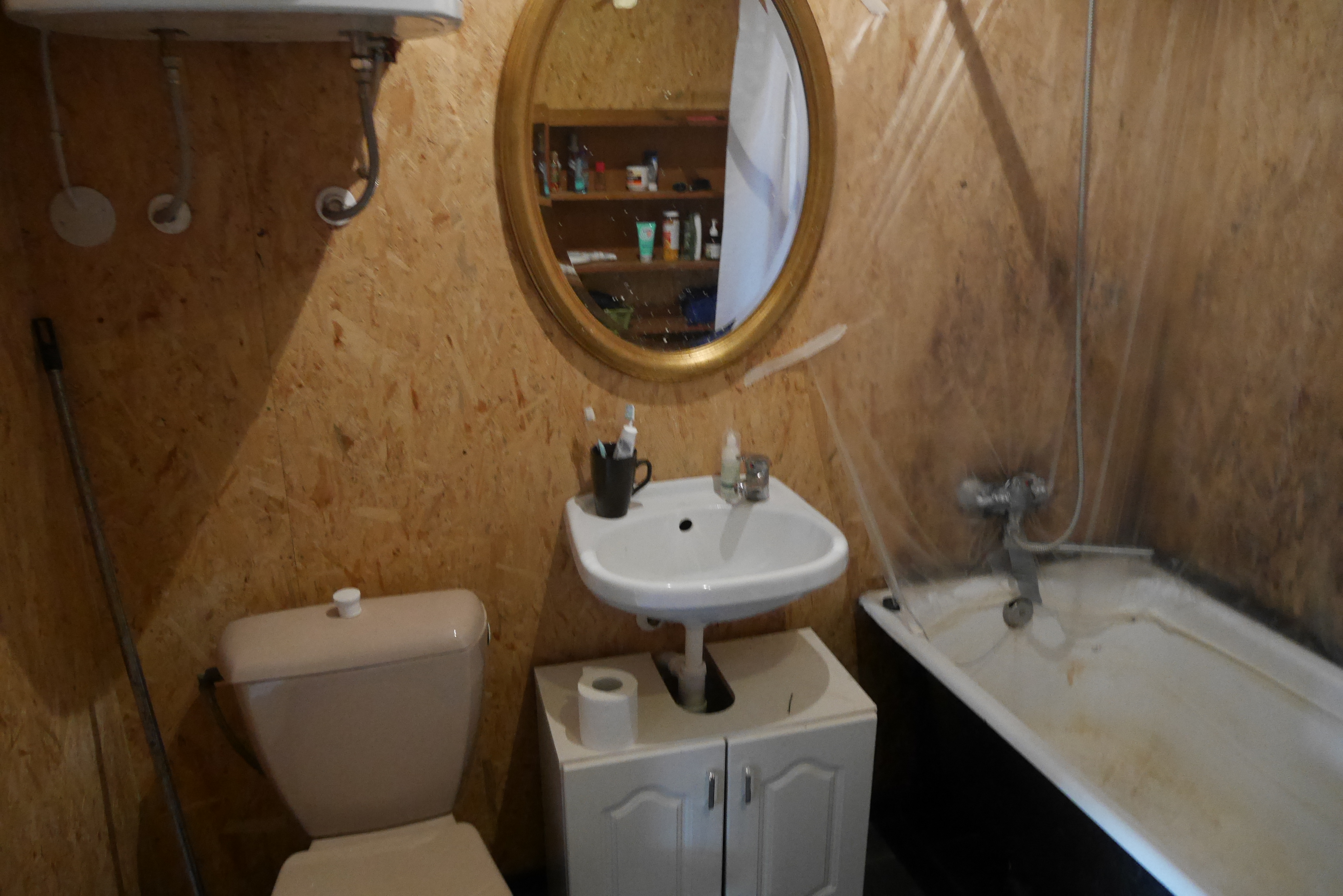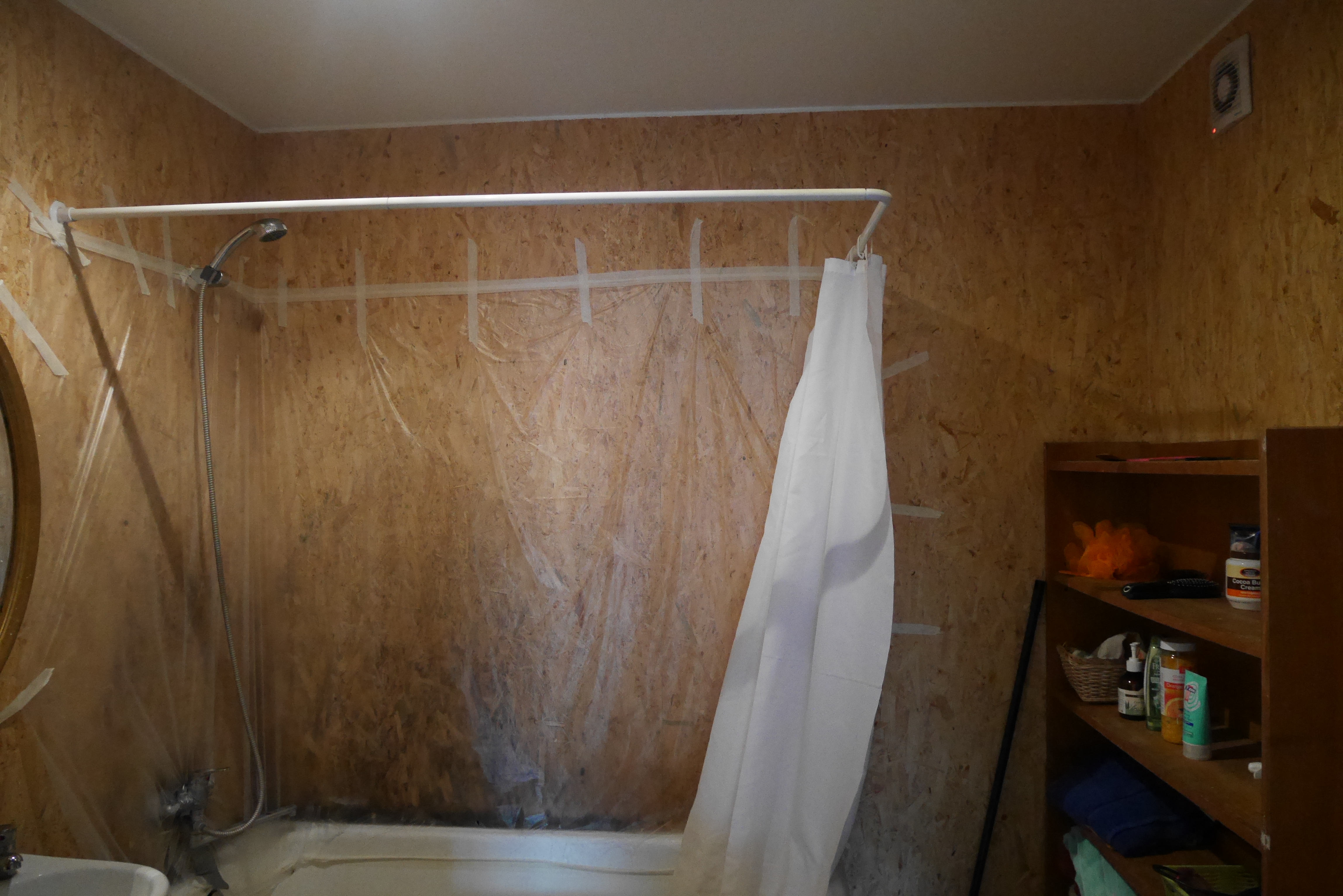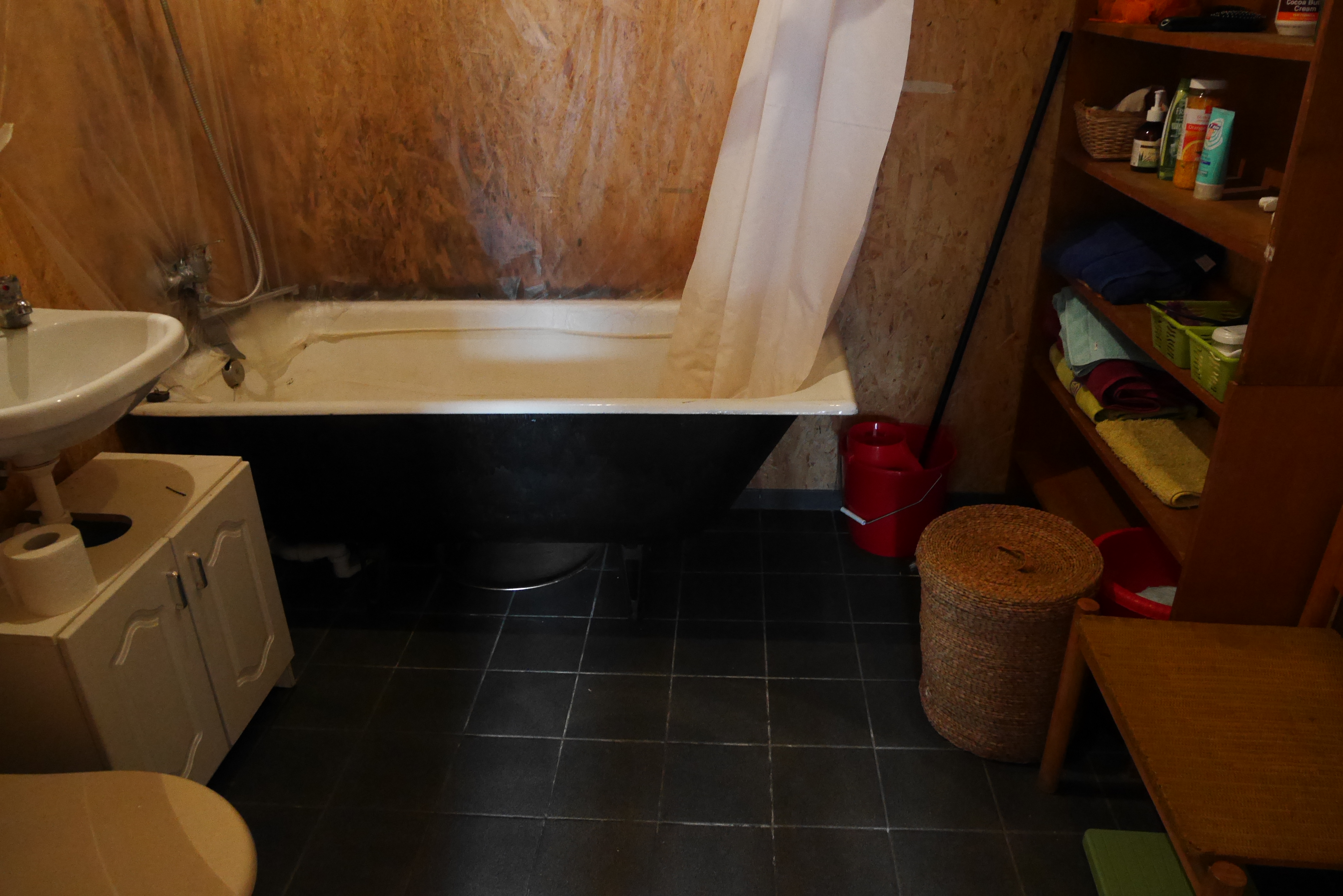 Vannituba 2,1*2,3m, 5m2. Põrand on plaaditud, seinad puitlaastplaat. Vanni juures vaja puitlaastplaat lahti võtta ja ära vahetada, seal on veekahjustus. Seina niiskustõke ja umbes 50% ulatuses plaatida (vannipoolsed seinad) ja 50% ulatuses värvida. Vanni võiks kuidagi valgendada, emailida vmt.