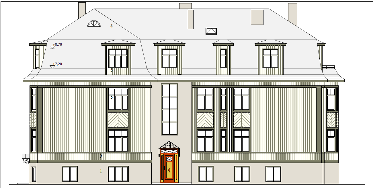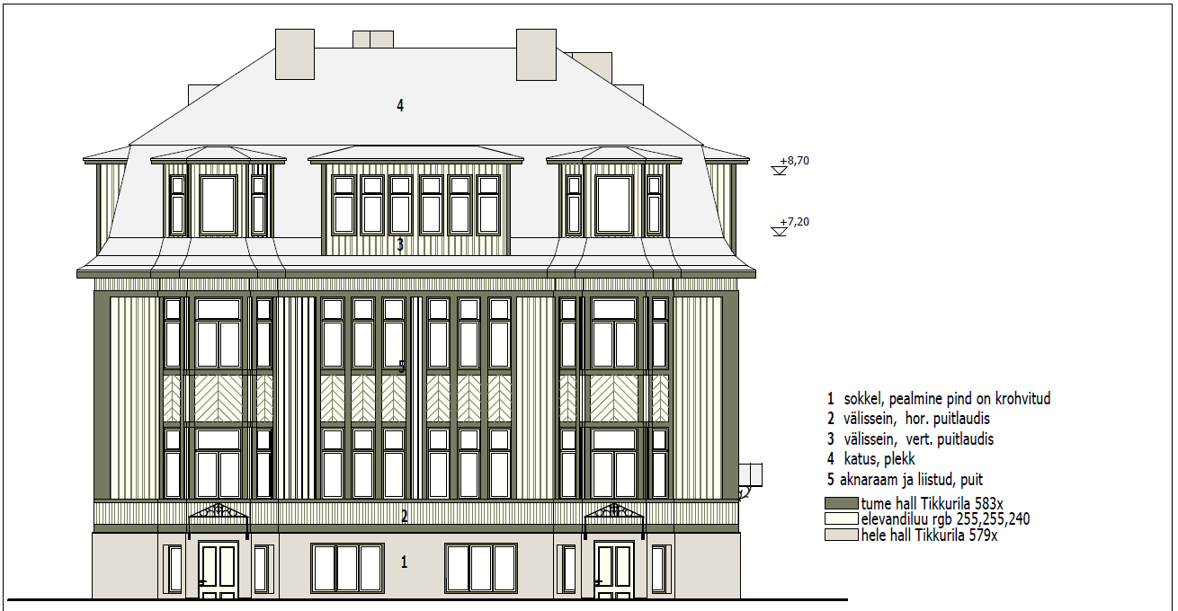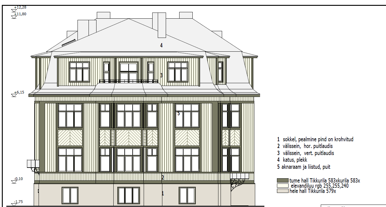 Nn. "tallinna tüüpi" korterelamu renoveerimine: olemasoleva laudise eemaldamine, püstpalkseinte takutamine, tuuletõkke paigaldus, uue laudise paigaldus (laudis peab olema täpne olemasoleva koopia) koos värvimisega. Tegemist on miljööalal paikneva ehitisega, kus on vaja täpselt järgida Kultuuriväärtuste Ameti ettekirjutust. Puidu kvaliteet on väga oluline. Sokli- ja trepikoja osa soojustamine 50 cm vahtpolüsterooli/ krohvitava villaga ning krohvimine. Sokkel vajalik lahtikaevata ning paigaldada samuti soojustus. Katusekorruse rõduga korter (peaukse poolt vaadatuna paremale jääv) on alles ehitatud, e. fassaaditööd seda ei puuduta rohkem kui värvimise osa. Hoonealune pind on 353,6 m², hoone ümbermõõt ca 77 m ja kõrgused märgitud joonisel.