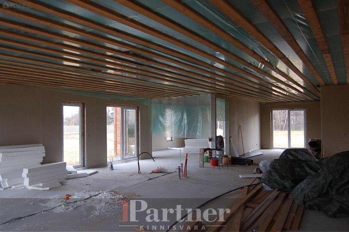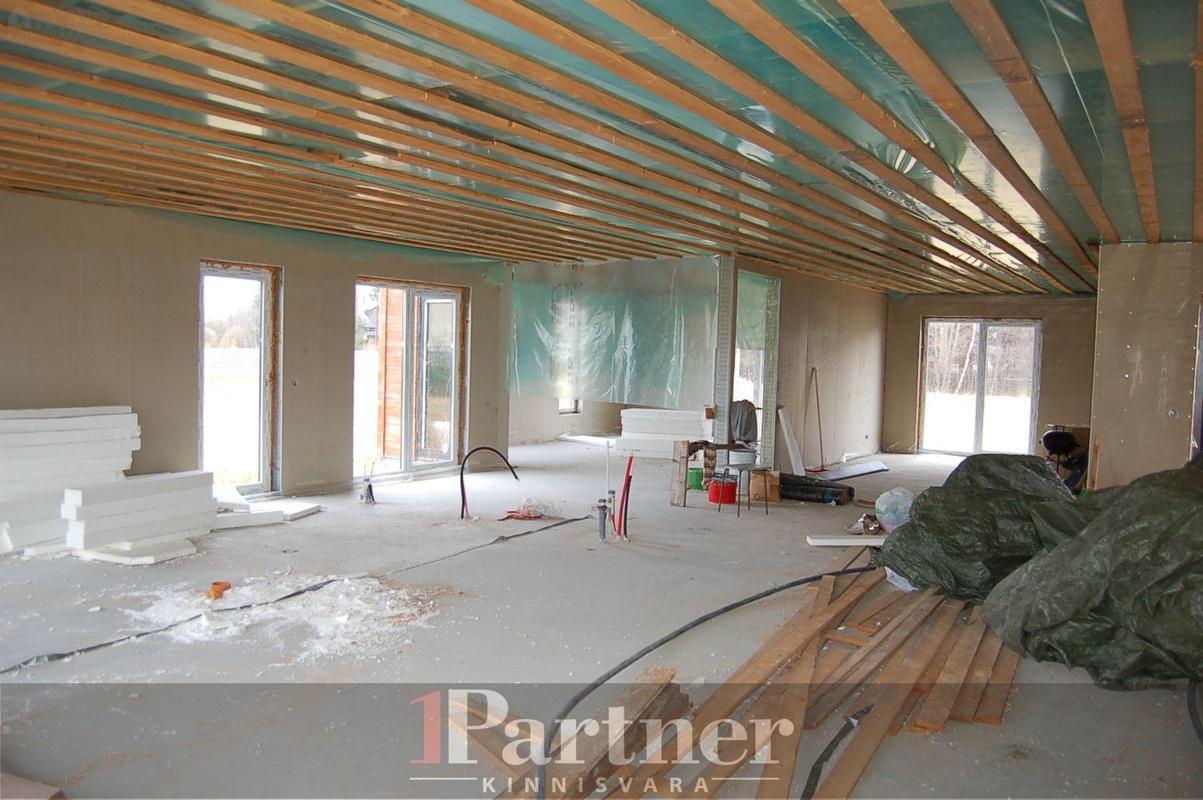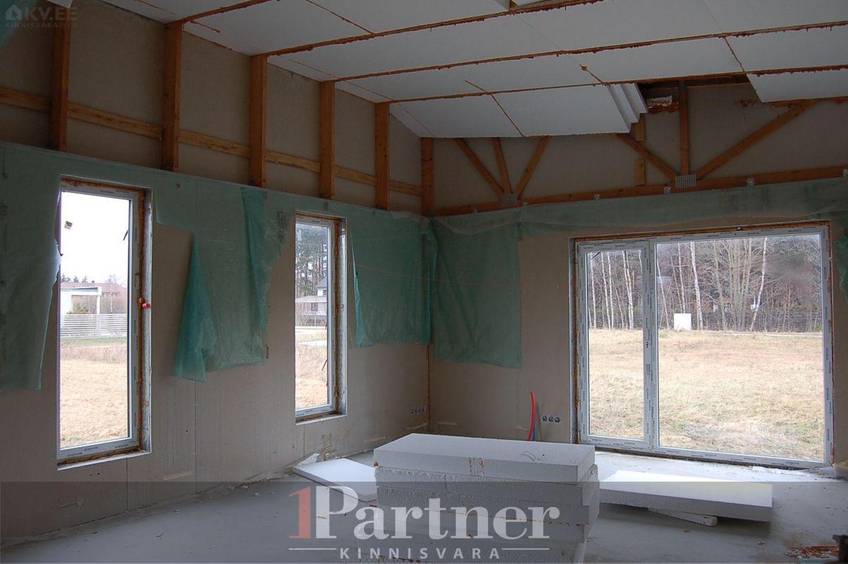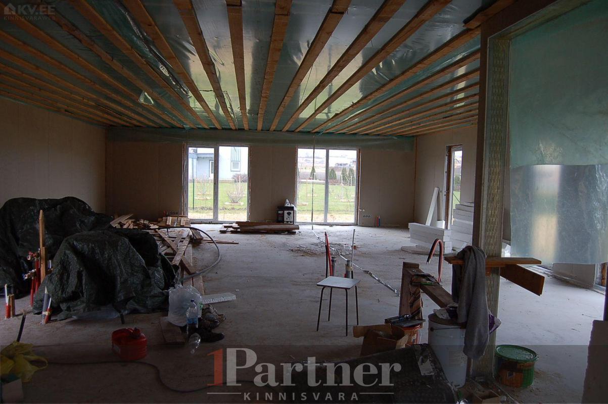 Hoone on rajatud 30cm paksustest Fibo plokkidest lintvundamendile, põrandaks korralikult soojustatud ning lihvitud betoonplaat, välisseinad teraskarkassil termoprofiilidest kergpaneelid (seinakarkass 175mm paksune galvaniseeritud terasprofiil, vahel soojustuseks mineraalvill), vaheseinad on projekteeritud mittekandvatena, katusekandjaks puitfermid (katusekalle 8°), katusekatteks kivipuistega SBS kummibituumen. Siseplaneeringus on elutuba (27,3 m²), maja keskossa jääv köök (11,3 m²), kolm magamistuba (mõõtudega 13,7 m², 15,8 m² , 14 m²), vannituba koos leiliruumiga (9,6 m²), garderoob (5,8 m²), eraldi asetsev WC (1,5 m²) ning tehniline/katlaruum (6,4 m²). Lisaks eluruumidele autovarjualune ning avar terrass, kuhu pääseb elutoast, vannitoast ning 15 m² suurusest magamistoast. Küttetorustik on põrandasse veetud, kommunikatsioonide otsad välja toodud. Tsentraalsete kommunikatsioonidega (vesi, kanalisatsioon, gaas, elekter 16A) liitutud, drenaaž välja ehitatud. Eramu on ehitatud ehitusloa alusel, korralik projektdokumentatsioon, olemas elektri- ja ventilatsiooniprojektid.