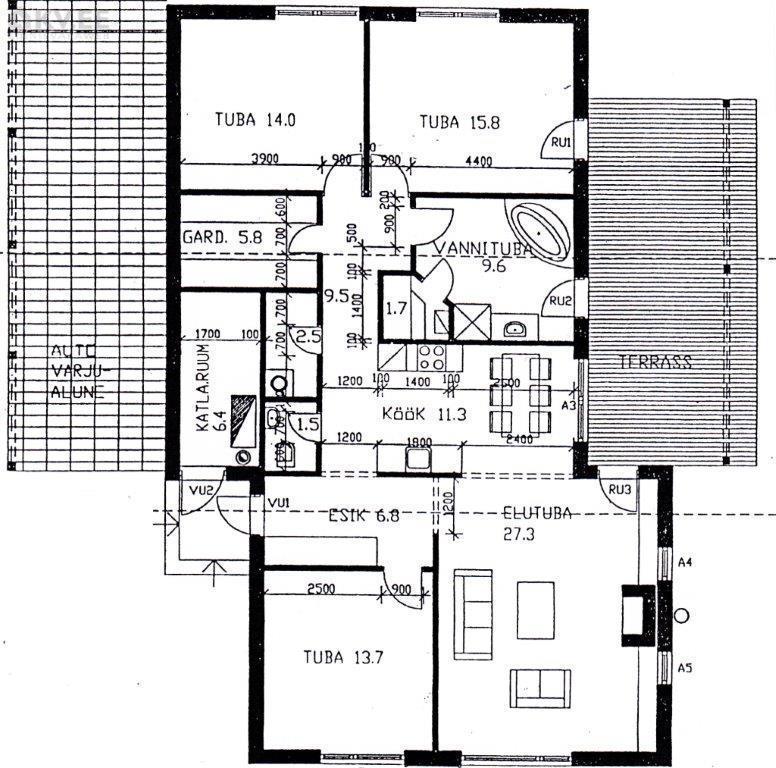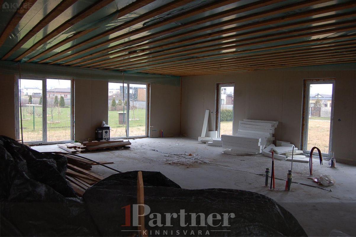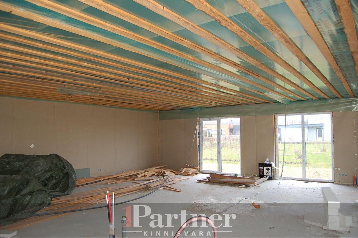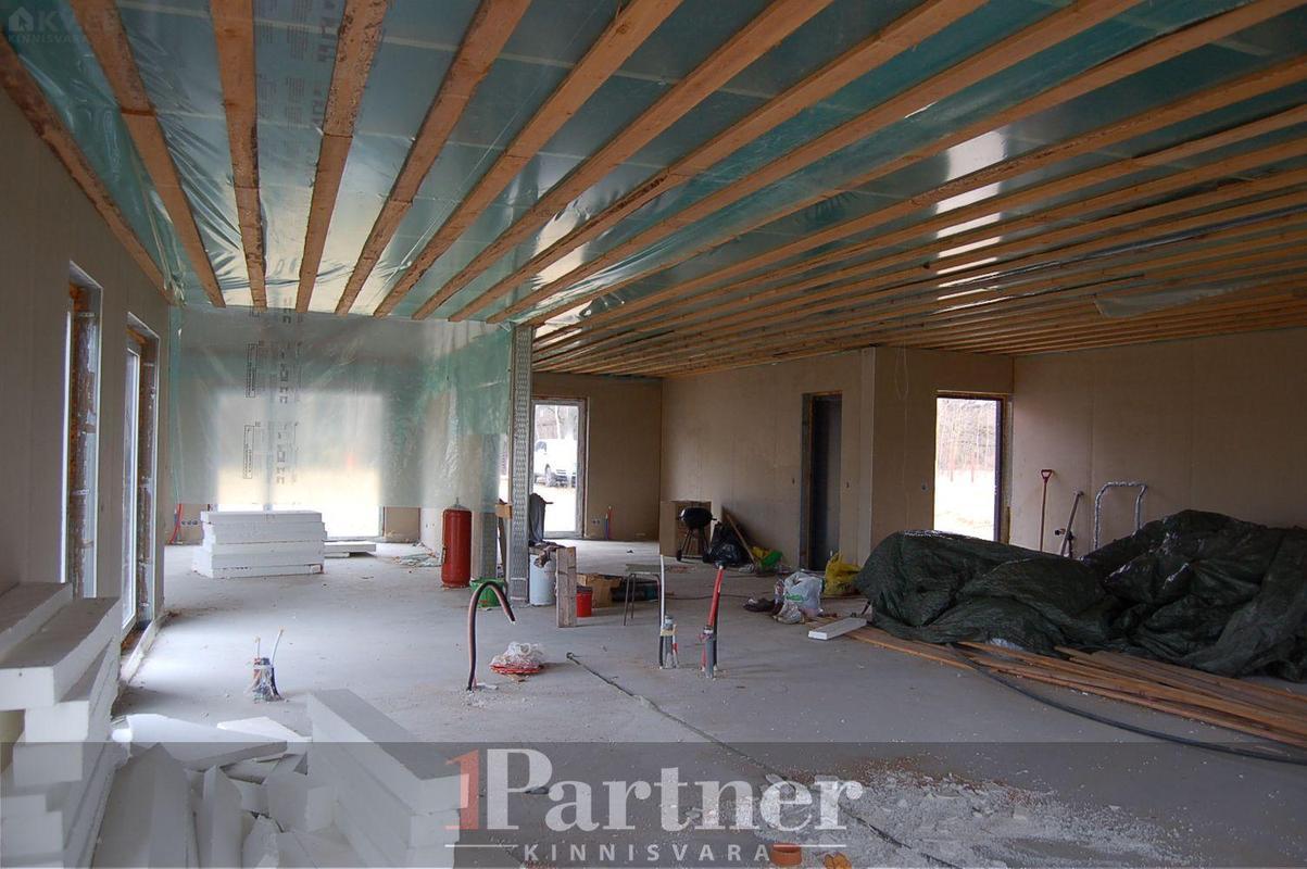 Hoone on rajatud 30cm paksustest Fibo plokkidest lintvundamendile, põrandaks korralikult soojustatud ning lihvitud betoonplaat, välisseinad teraskarkassil termoprofiilidest kergpaneelid (seinakarkass 175mm paksune galvaniseeritud terasprofiil, vahel soojustuseks mineraalvill), vaheseinad on projekteeritud mittekandvatena, katusekandjaks puitfermid (katusekalle 8°), katusekatteks kivipuistega SBS kummibituumen. Siseplaneeringus on elutuba (27,3 m²), maja keskossa jääv köök (11,3 m²), kolm magamistuba (mõõtudega 13,7 m², 15,8 m² , 14 m²), vannituba koos leiliruumiga (9,6 m²), garderoob (5,8 m²), eraldi asetsev WC (1,5 m²) ning tehniline/katlaruum (6,4 m²). Lisaks eluruumidele autovarjualune ning avar terrass, kuhu pääseb elutoast, vannitoast ning 15 m² suurusest magamistoast. Küttetorustik on põrandasse veetud, kommunikatsioonide otsad välja toodud. Tsentraalsete kommunikatsioonidega (vesi, kanalisatsioon, gaas, elekter 16A) liitutud, drenaaž välja ehitatud. Eramu on ehitatud ehitusloa alusel, korralik projektdokumentatsioon, olemas elektri- ja ventilatsiooniprojektid.